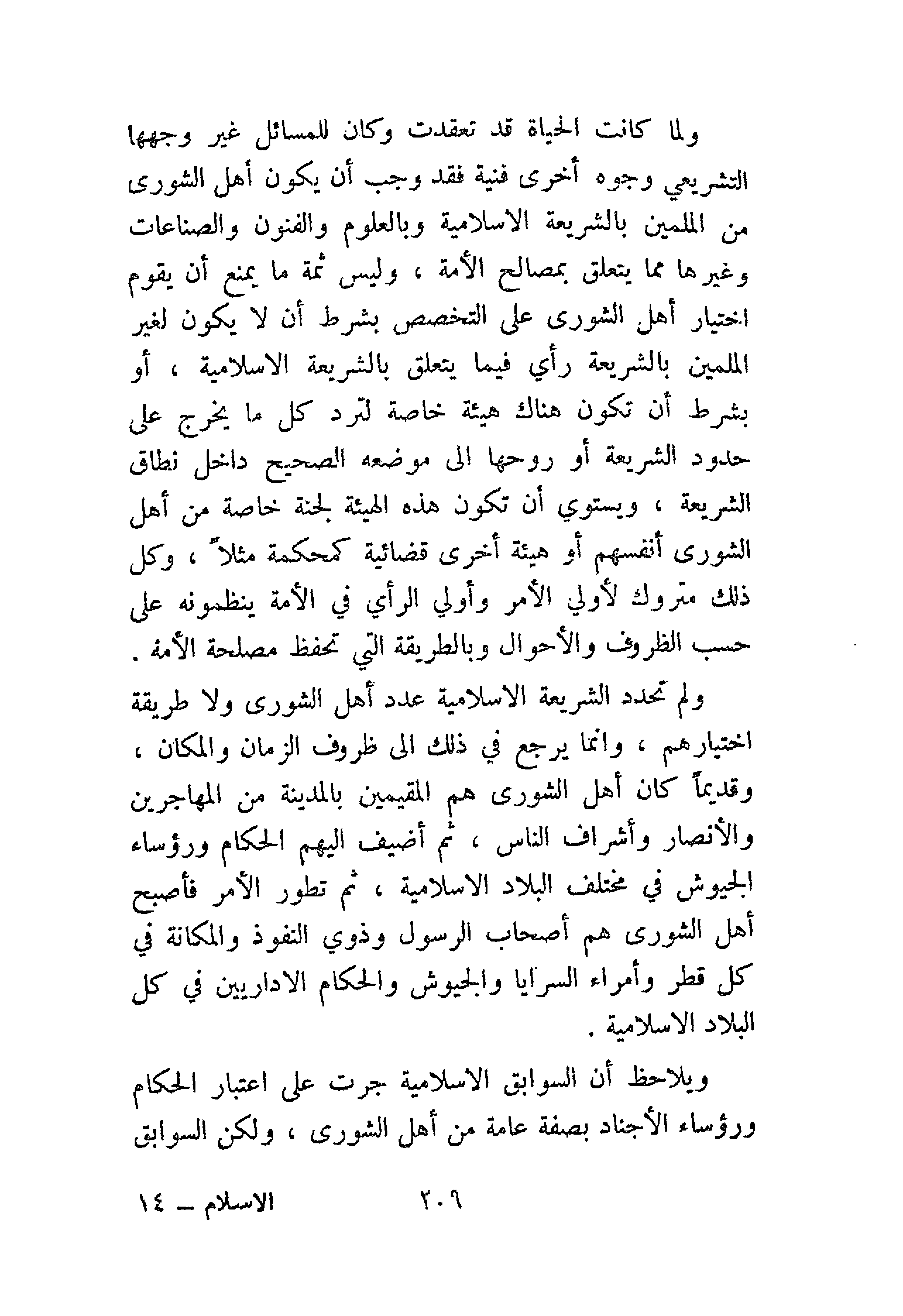 ولما كانت الحياة قد تعقدت وكان للمسائل غير وجهها التشريعي وجوهًا أخرى فنية فقد وجب أن يكون أهل الشورى الملمين بالشريعة الإسلامية وبالعلوم والفنون والصناعات وغيرها مِمَّا يتعلق بمصالح الأمة، وليس ثمة ما يمنع أن يقوم اختيار أهل الشورى على التخصص بشرط أن لا يكون لغير الملمين بالشريعة رأي فيما يتعلق بالشريعة الإسلامية، أو بشرط أن تكون هناك هيئة خاصة لترد كل ما يخرج على حدود الشريعة أو روحها إلى موضعه الصحيح داخل نطاق الشريعة، ويستوي أن تكون هذه الهيئة لجنة خاصة من أهل الشورى أنفسهم أو هيئة أخرى قضائية كمحكمة مثلاً، وكل ذلك متروك لأولي الأمر وأولي الرأي في الأمة ينظمونه على حسب الظروف والأحوال وبالطريقة التي تحفظ مصالح الأمة.