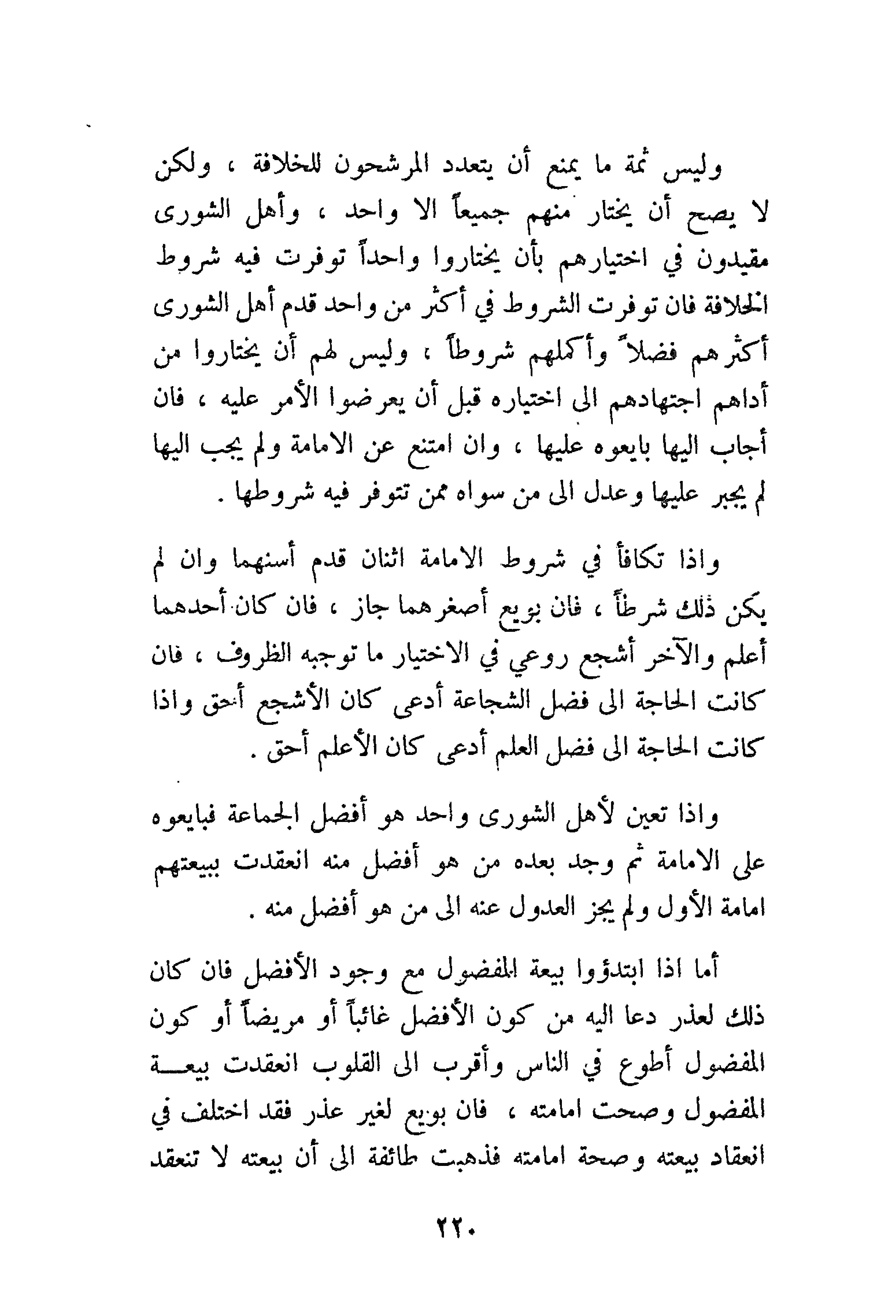 وإذا تعين لأهل الشورى واحد هو أفضل الجماعة فبايعوه على الإمامة ثم وجد بعده من هو أفضل منه انعقدت ببيعتهم إمامة الأول ولم يجز العدول عنه إلى من هو أفضل منه.