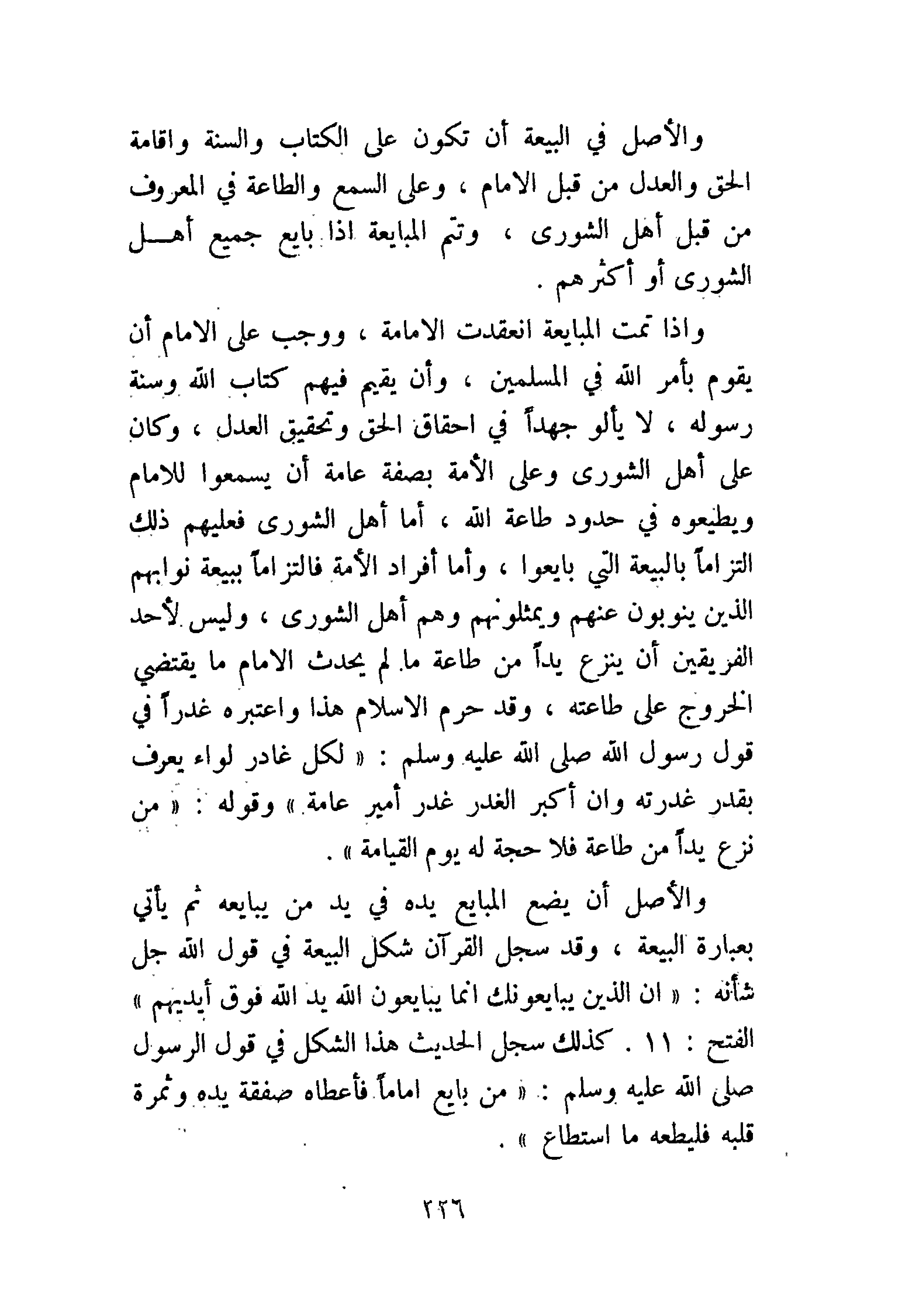 وإذا تمت المبايعة انعقدت الإمامة، ووجب على الإمام أن يقوم بأمر الله في المسلمين، وأن يقيم فيهم كتاب الله وسنة رسوله، لا يألو جهدًا في إحقاق الحق وتحقيق العدل، وكان على أهل الشورى وعلى الأمة بصفة عامة أن يسمعوا للإمام ويطيعوه في حدود طاعة الله، أما أهل الشورى فعليهم ذلك التزامًا بالبيعة التي بايعوا، وأما أفراد الأمة فالتزامًا ببيعة نوابهم الذين ينوبون عنهم ويمثلونهم وهم أهل الشورى، وليس لأحد الفريقين أن ينزع يَدًا من طاعة ما لم يحدث الإمام ما يقتضي الخروج على طاعته، وقد حرم الإسلام هذا واعتبره غدرًا في قول رسول الله - صَلََّى اللهُ عَلَيْهِ وَسَلَّمَ -: «إِنَّ لِكُلِّ غَادِرٍ لِوَاءً يُعْرَفُ بِقَدْرِ غَدْرَتِهِ، وَإِنَّ أَكْبَرَ الغَدْرِ غَدْرُ أَمِيرِ عَامَّةٍ» وقوله: «مَنْ نَزَعَ يَدًا مِنْ طَاعَةٍ، فَلاَ حُجَّةَ لَهُ يَوْمَ القِيَامَةِ».