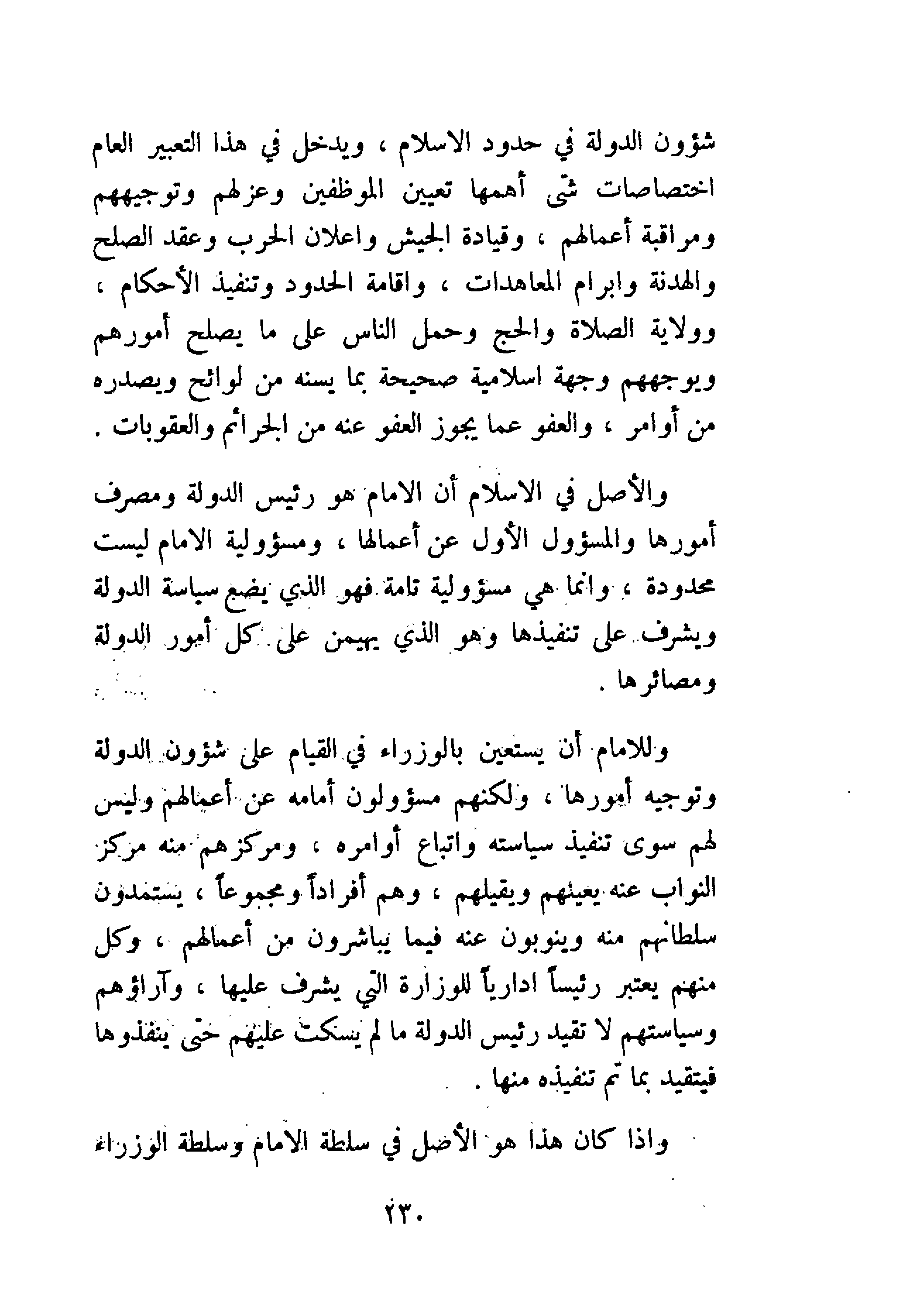 وللإمام أن يستعين بالوزراء في القيام على شؤون الدولة وتوجيه أمورها، ولكنهم مسؤولون أمامه عن أعمالهم وليس لهم سوى تنفيذ سياسته واتباع أوامره، ومركزهم منه مركز النواب عنه يعينهم ويقيلهم، وهم أفراد أو مجموعات، يستمدون سلطانهم منه وينوبون عنه فيما يباشرون من أعمالهم، وكل منهم يعتبر رئيسًا إداريًا للوزارة التي يشرف عليها، وآراؤهم وسياستهم لا تقيد رئيس الدولة ما لم يسكت عليهم حتى ينفذوها فيتقيد بما تم تنفيذه منها.