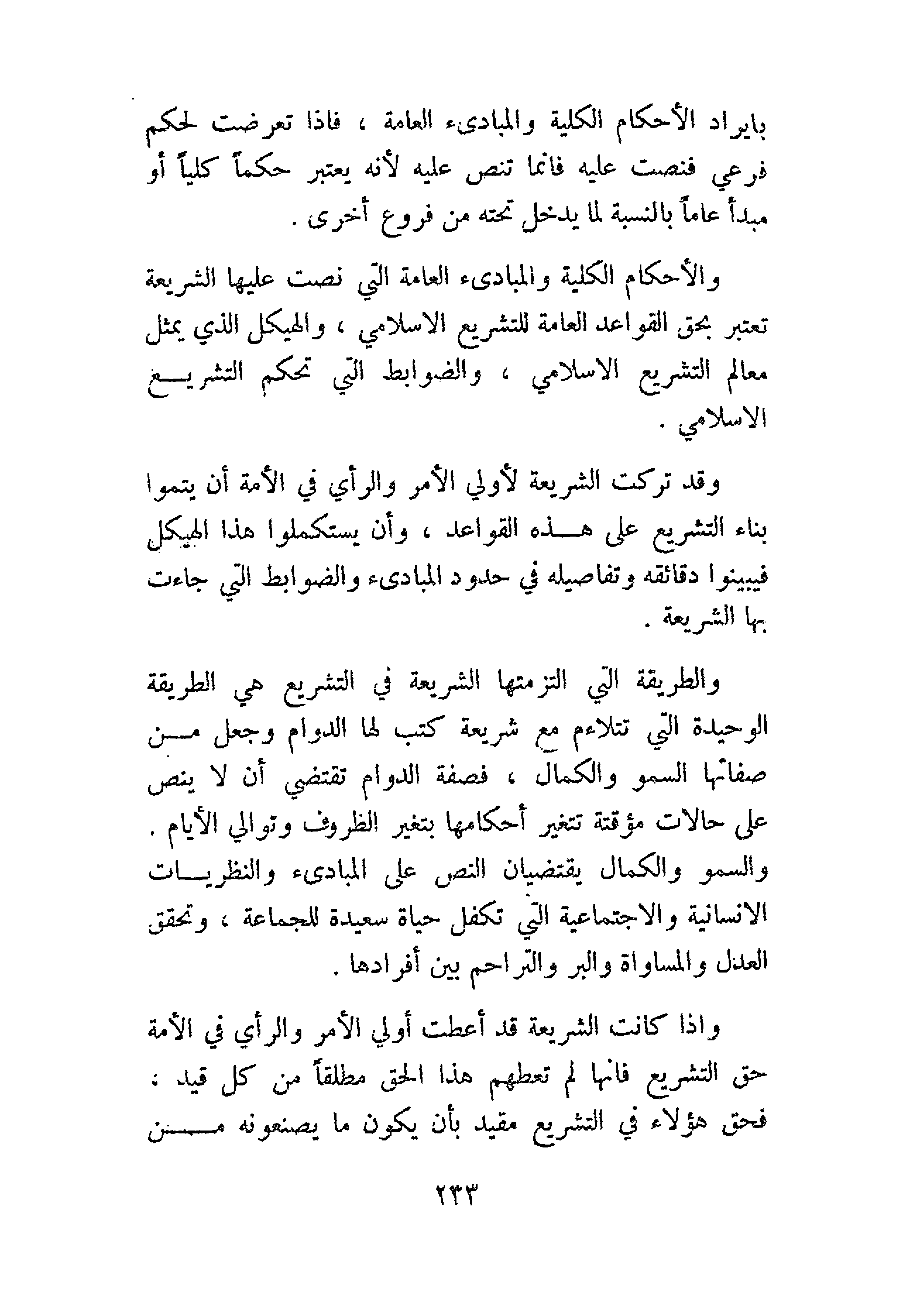 وقد تركت الشريعة لأولي الأمر والرأي في الأمة أن يتموا بناء التشريع على هذه القواعد، وأن يستكملوا هذا الهيكل فيبينوا دقائقه وتفاصيله في حدود المبادئ والضوابط التي جاءت بها الشريعة.