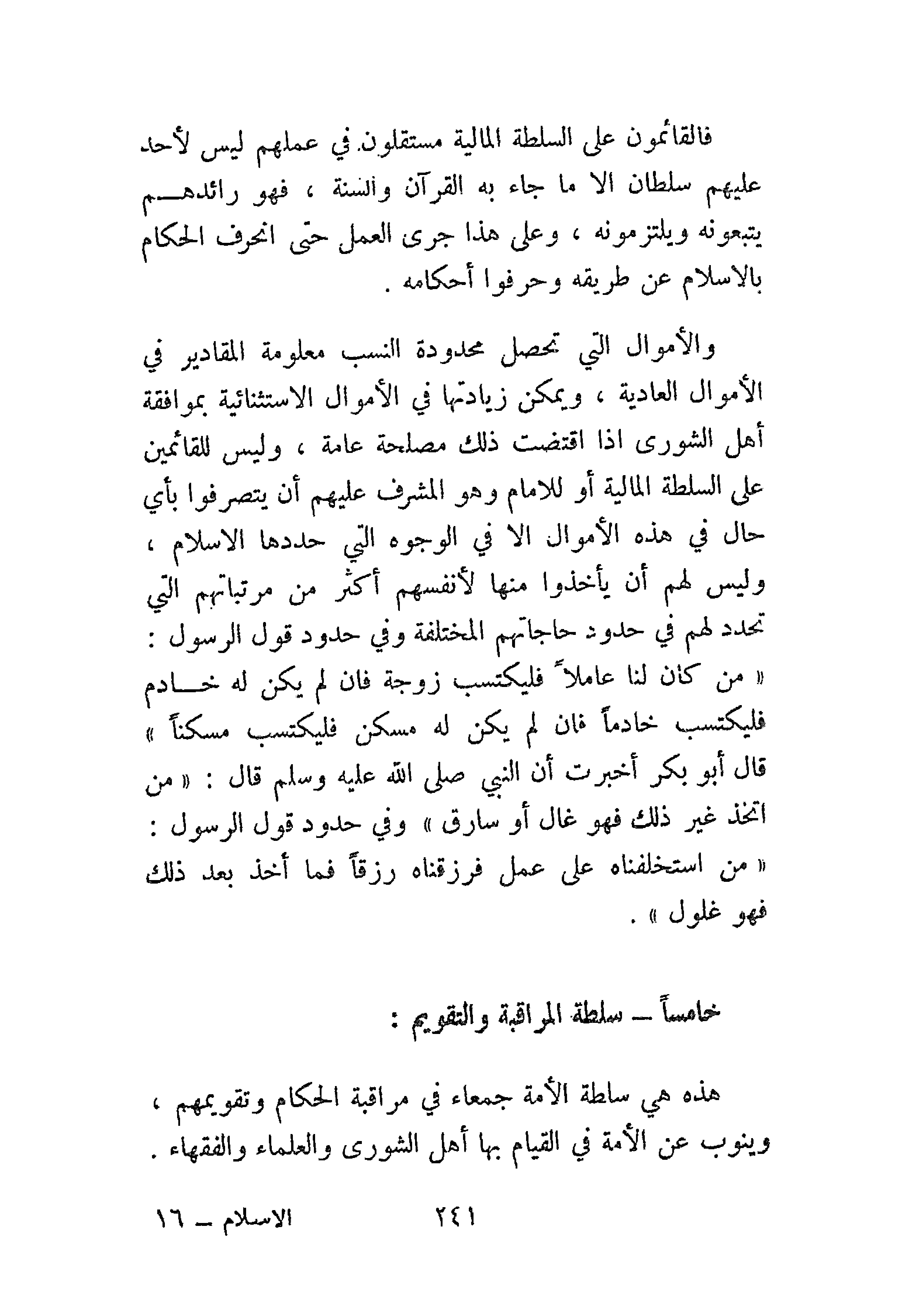 هذه هي سلطة الأمة جمعاء في مراقبة الحكام وتقويمهم، وينوب عن الأمة في القيام بها أهل الشورى والعلماء والفقهاء.