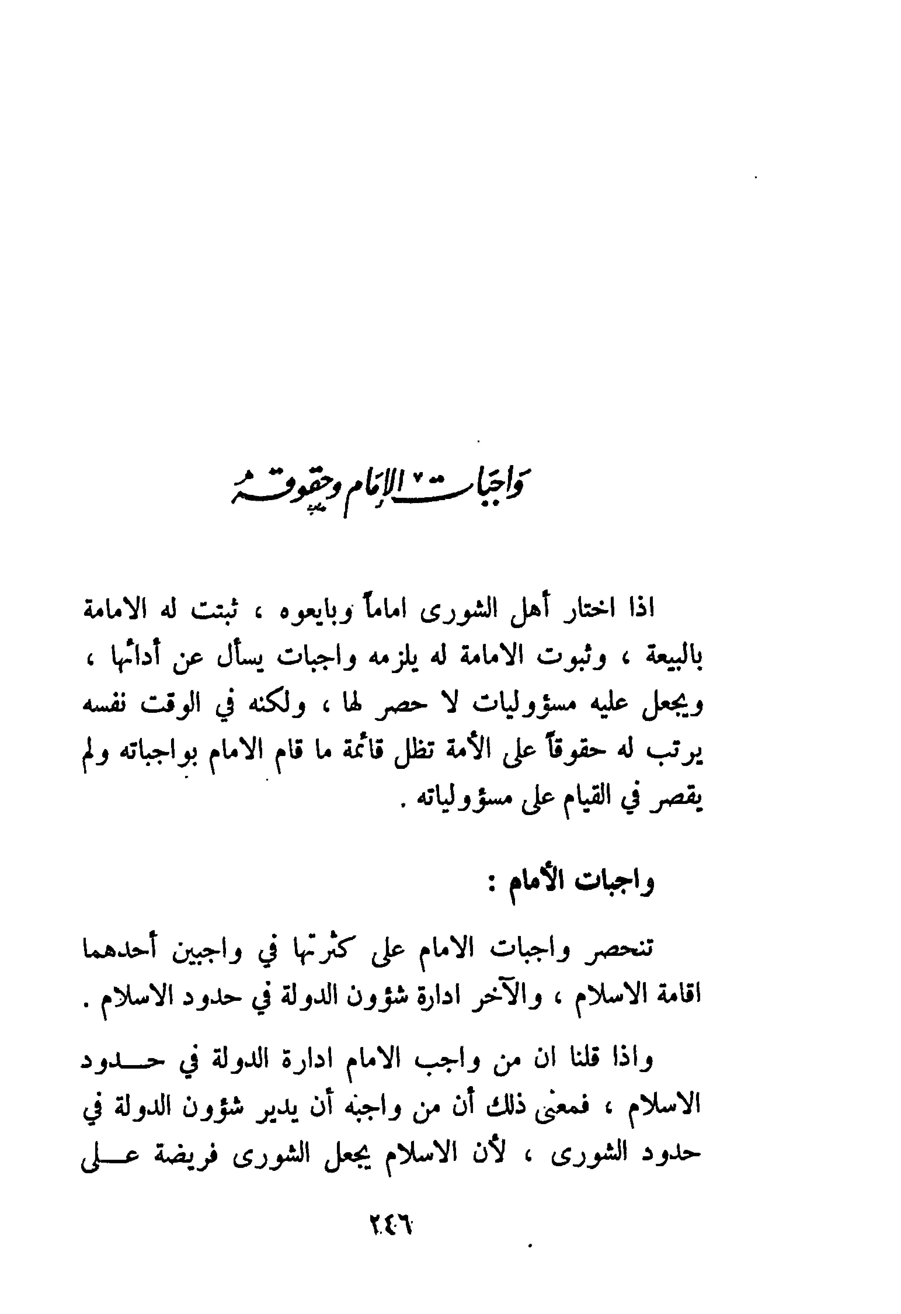 وإذا قلنا أن من واجب الإمام إدارة الدولة في حدود الإسلام، فمعنى ذلك أن من واجبه أن يدير شؤون الدولة في حدود الشورى، لأن الإسلام يجعل الشورى فريضة على