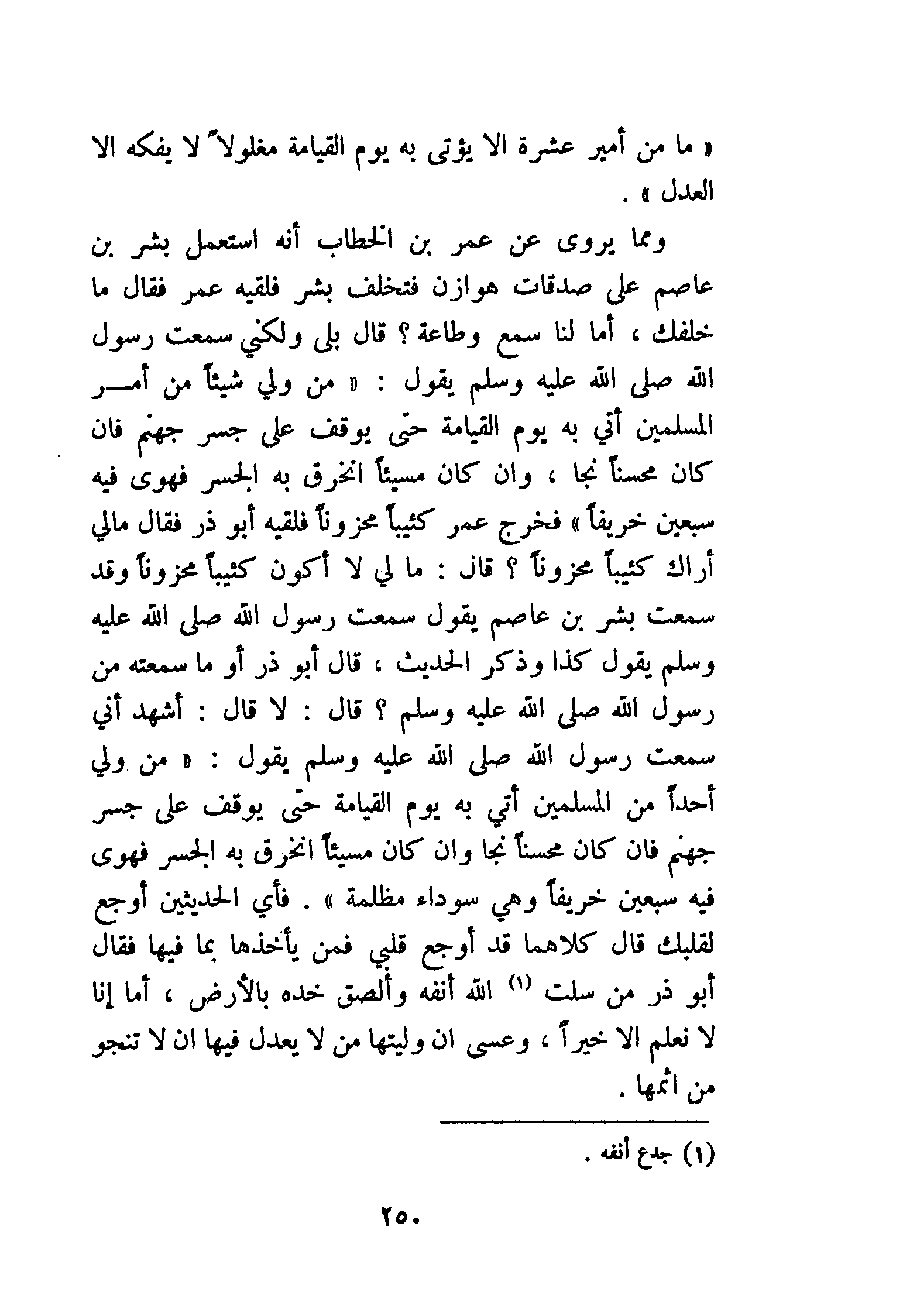 وَمِمَّا يُرْوَى عَنْ عُمَرَ بْنَ الْخَطَّابِ أَنَّهُ اسْتَعْمَلَ بِشْرَ بْنَ عَاصِمٍ عَلَى صَدَقَاتِ هَوَازِنَ فَتَخَلُّفِ بِشْرٌ، فَلَقِيَهُ عُمَرُ فَقَالَ: مَا خَلَّفَكَ؟ أَمَا لَنَا عَلَيْكَ سَمْعٌ وَطَاعَةٌ؟ فَقَالَ: بَلَى، وَلَكِنِّي سَمِعْتُ رَسُولَ اللَّهِ صَلَّى اللَّهُ عَلَيْهِ وَسَلَّمَ يَقُولُ: «مَنْ وَلِيَ شَيْئًا مِنْ أَمْرِ الْمُسْلِمِينَ أُتِيَ بِهِ يَوْمَ القِيَامَةِ حَتَّى يُوقَفَ عَلَى جِسْرِ جَهَنَّمَ، فَإِنْ كَانَ مُحْسِنًا نَجَا، وَإِنْ كَانَ مُسِيئًا انْحَرَفَ الجِسْرُ فَهَوَى فِيهِ سَبْعِينَ خَرِيفًا».