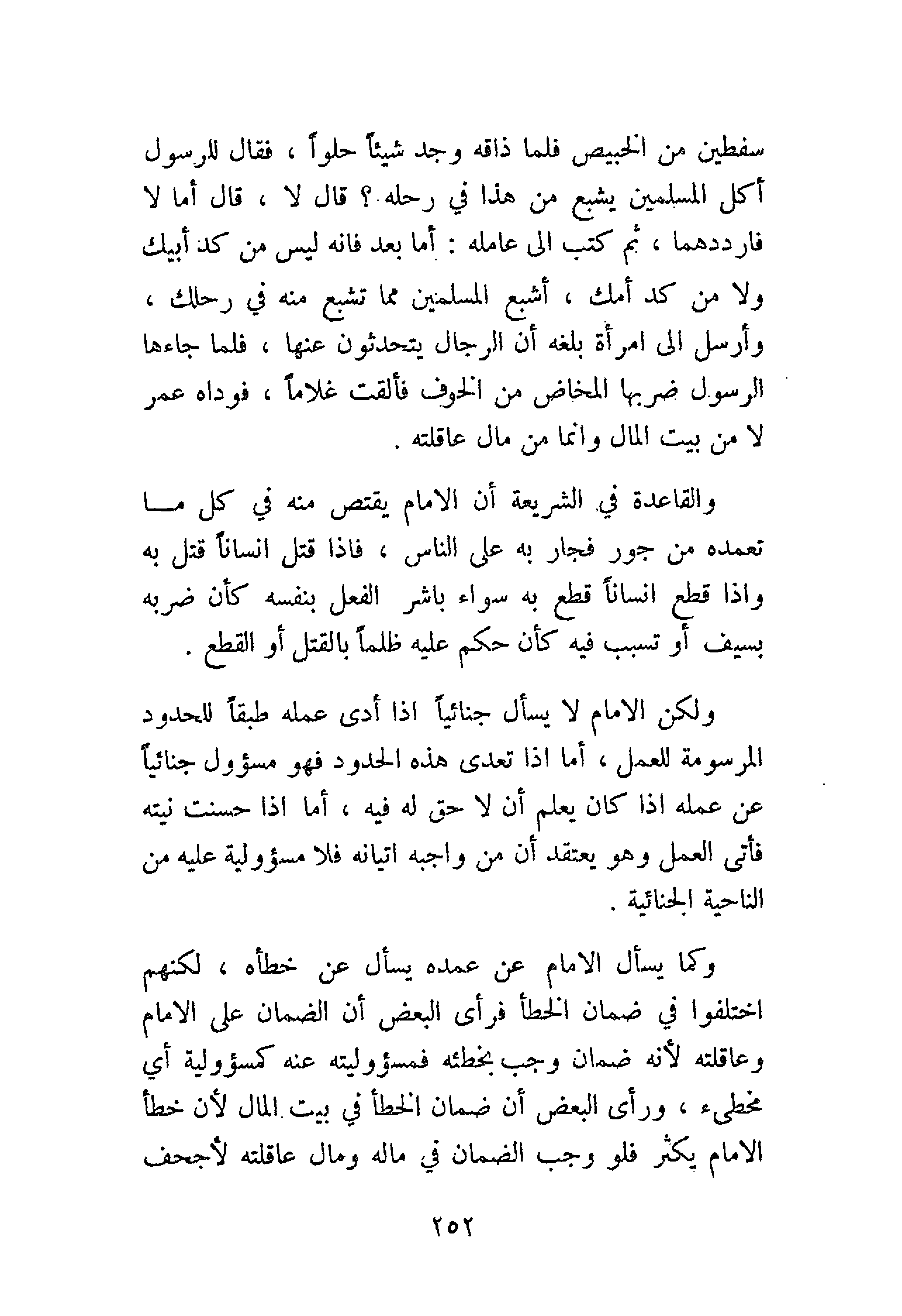 ولكن الإمام لا يسأل جنائيًا إذا أدى عمله طبقًا للحدود المرسومة للعمل، أما إذا تعدى هذه الحدود فهو مسؤول جنائيًا عن عمله إذا كان يعلم أن لا حق له فيه، أما إذا حسنت نيته فأتى العمل وهو يعتقد أن من واجبه إتيانه فلا مسؤولية عليه من الناحية الجنائية.