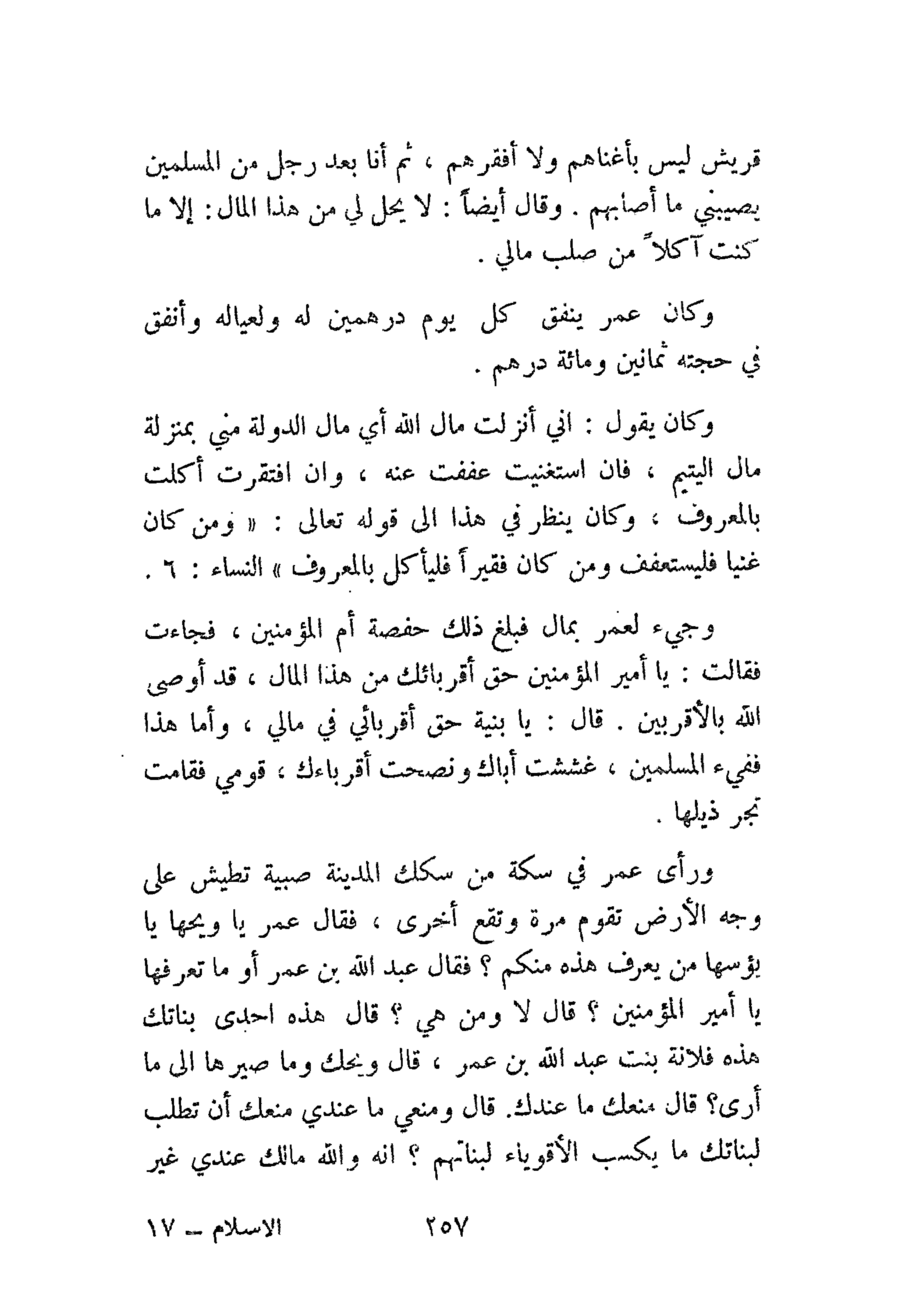 وكان يقول: «إِنِّي أَنْزَلْتُ مَالَ اللهِ - أي مال الدولة - مِنِّي بِمَنْزِلَةِ مَالِ اليَتِيمِ، فَإِنْ اسْتَغْنَيْتُ عَفَفْتُ عَنْهُ، وَإِنْ افْتَقَرْتُ أَكَلْتُ بِالمَعْرُوفِ»، وكان ينظر في هذا إلى قوله تعالى: {وَمَنْ كَانَ غَنِيًّا فَلْيَسْتَعْفِفْ وَمَنْ كَانَ فَقِيرًا فَلْيَأْكُلْ بِالْمَعْرُوفِ} [النساء: 6].