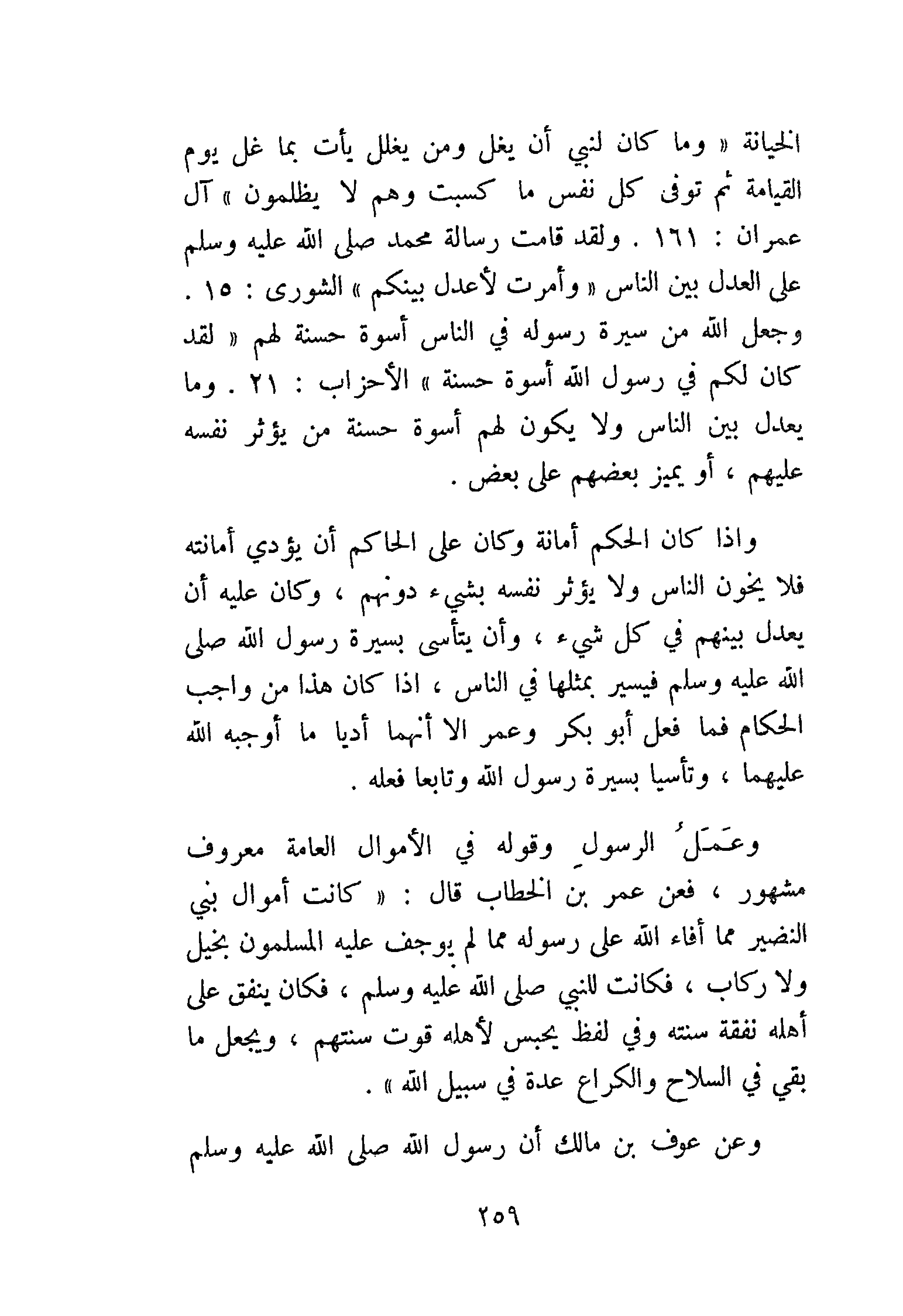 وإذا كان الحكم أمانة وكان على الحاكم أن يؤدي أمانته فلا يخون الناس ولا يؤثر نفسه بشيء دونهم، وكان عليه أن يعدل بينهم في كل شيء، وأن يتأسى بسيرة رسول الله - صَلََّى اللهُ عَلَيْهِ وَسَلَّمَ - فسيسير بمثلها في الناس، إذا كان هذا من واجب الحكام فما فعل أبوبكر وعمر إلا أنهما أَدَّيَا ما أوجبه الله عليهما، وَتَأَسَّيَا بسيرة رسول الله وَتَابَعَا فعله.