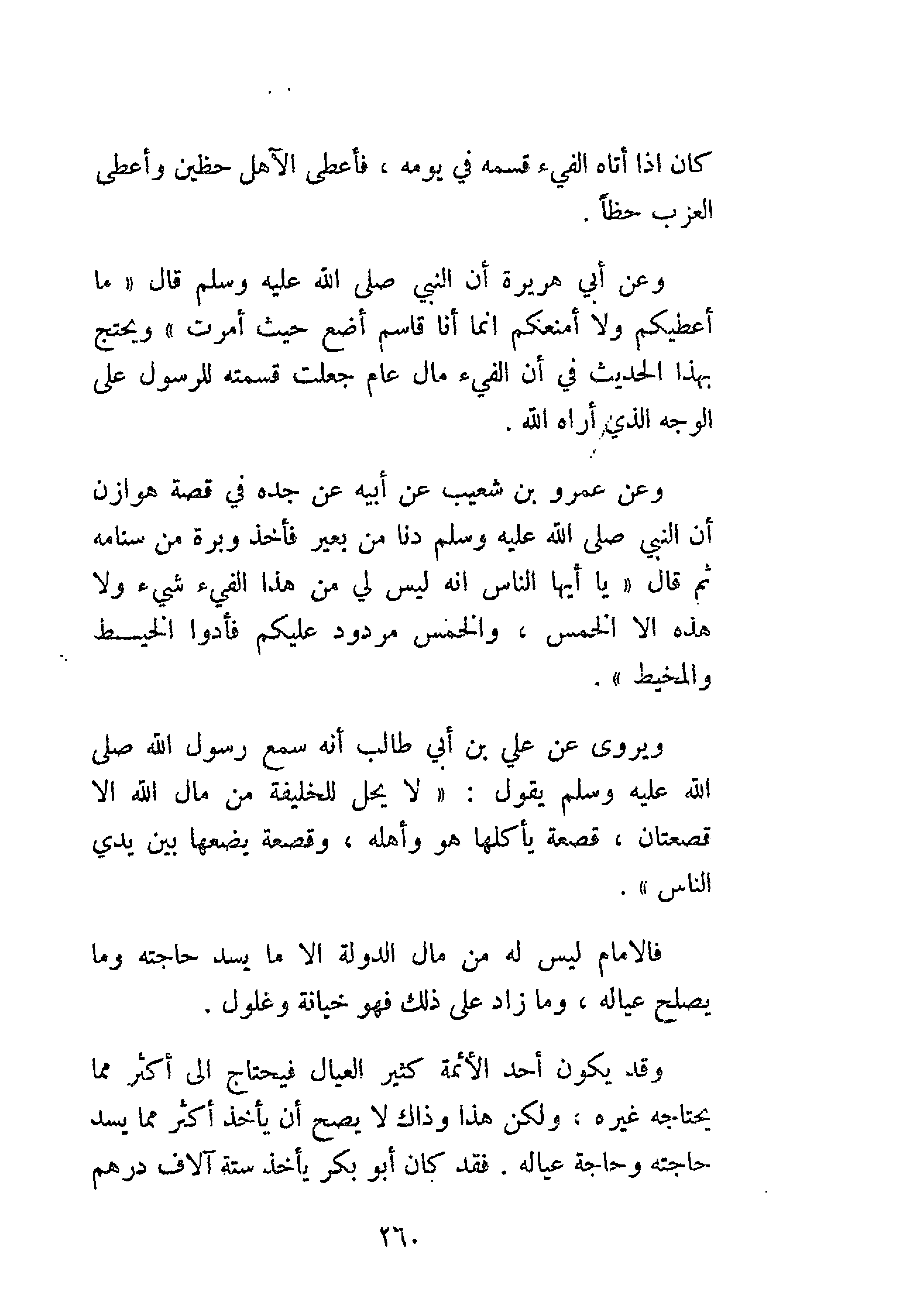 ويروى عن علي بن أبي طالب أنه سمع رَسُولَ اللَّهِ صَلَّى اللهُ عَلَيْهِ وَسَلَّمَ يَقُولُ: «لاَ يَحِلُّ لِلْخَلِيفَةِ مِنْ مَالِ اللَّهِ، إِلاَّ قَصْعَتَانِ، قَصْعَةٌ يَأْكُلُهَا هُوَ وَأَهْلُهُ، وَقَصْعَةٌ يَضَعُهَا بَيْنَ يَدَيِ النَّاسِ».