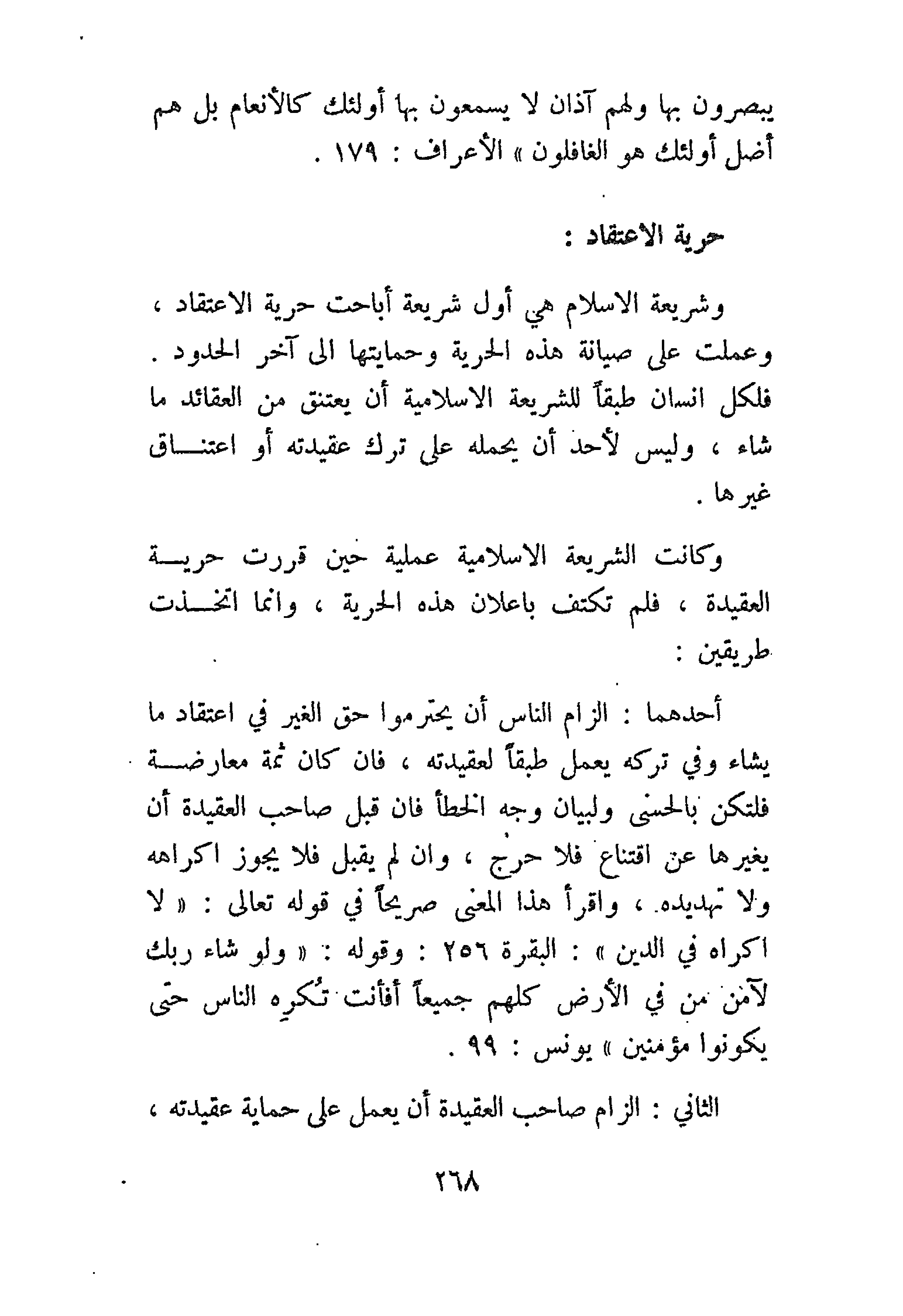 أحدهما: إلزام الناس أن يحترموا حق الغير في اعتقاد ما يشاء وفي تركه يعمل طبقًا لعقيدته، فإن كان ثمة معارضة فلتكن بالحسنى ولبيان وجه الخطأ فإن قبل صاحب العقيدة أن يغيرها عن اقتناع فلا حرج، وإن لم يقبل فلا يجوز إكراهه ولا تهديده، واقرأ هذا المعنى صريحًا في قوله تعالى: {لاَ إِكْرَاهَ فِي الدِّينِ} [البقرة: 256]، وقوله: {وَلَوْ شَاءَ رَبُّكَ لآمَنَ مَنْ فِي الأَرْضِ كُلُّهُمْ جَمِيعًا أَفَأَنْتَ تُكْرِهُ النَّاسَ حَتَّى يَكُونُوا مُؤْمِنِينَ} [يونس: 99].