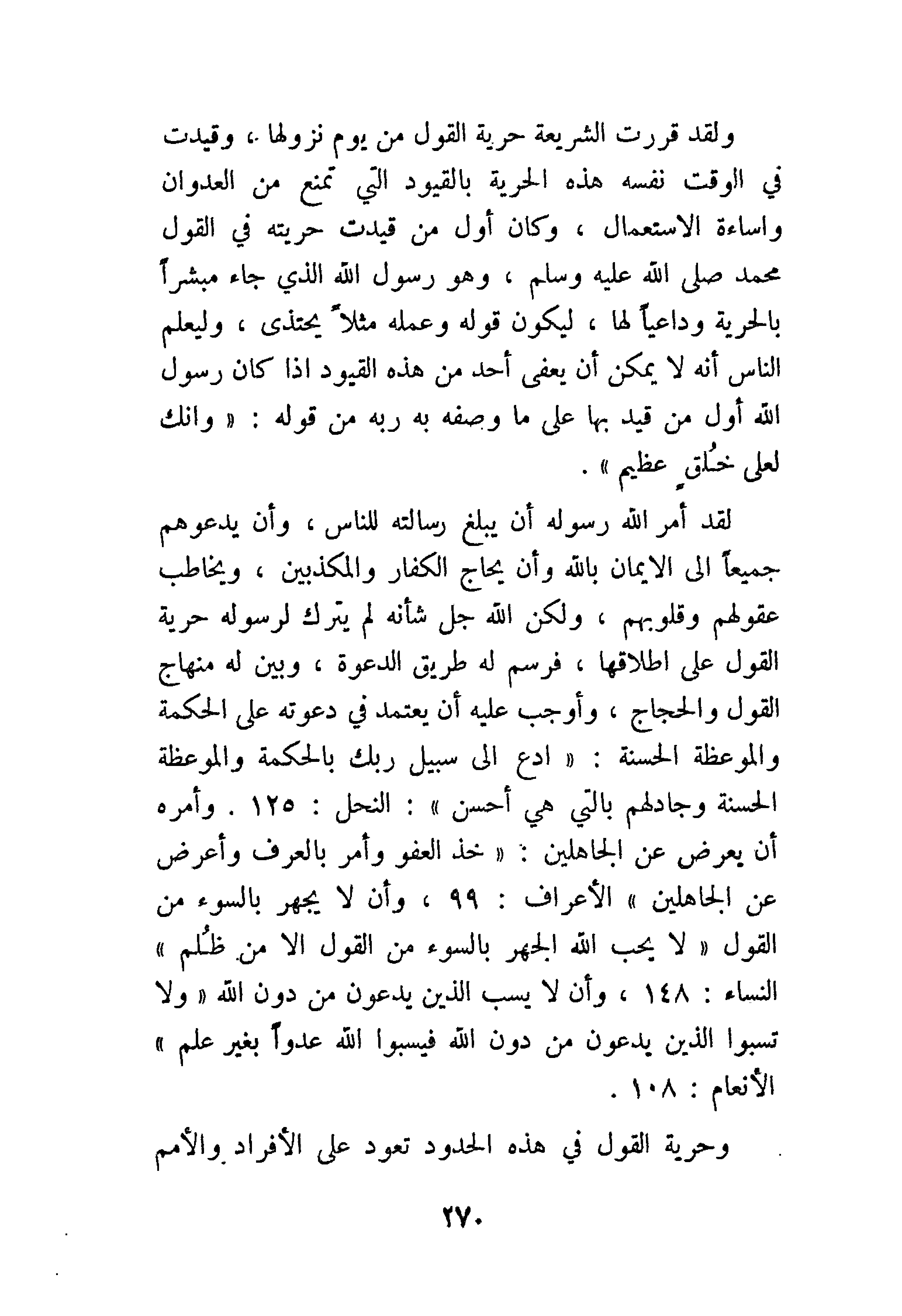 ولقد قررت الشريعة حرية القول من يوم نزولها، وقيدت في الوقت نفسه هذه الحرية بالقيود التي تمنع من العدوان وإساءة الاستعمال، وكان أول من قيدت حريته في القول محمد - صَلََّى اللهُ عَلَيْهِ وَسَلَّمَ -، وهو رسول الله الذي جاء مبشرًا بالحرية وداعيًا لها، ليكون قوله وعمله مثلاً يحتذى، وليعلم الناس أن لا يمكن أن يعفى أحد من هذه القيود إذا كان رسول الله أولى من قيد بها على ما وصفه به ربه من قوله: {وَإِنَّكَ لَعَلَى خُلُقٍ عَظِيمٍ} [القلم: 4].