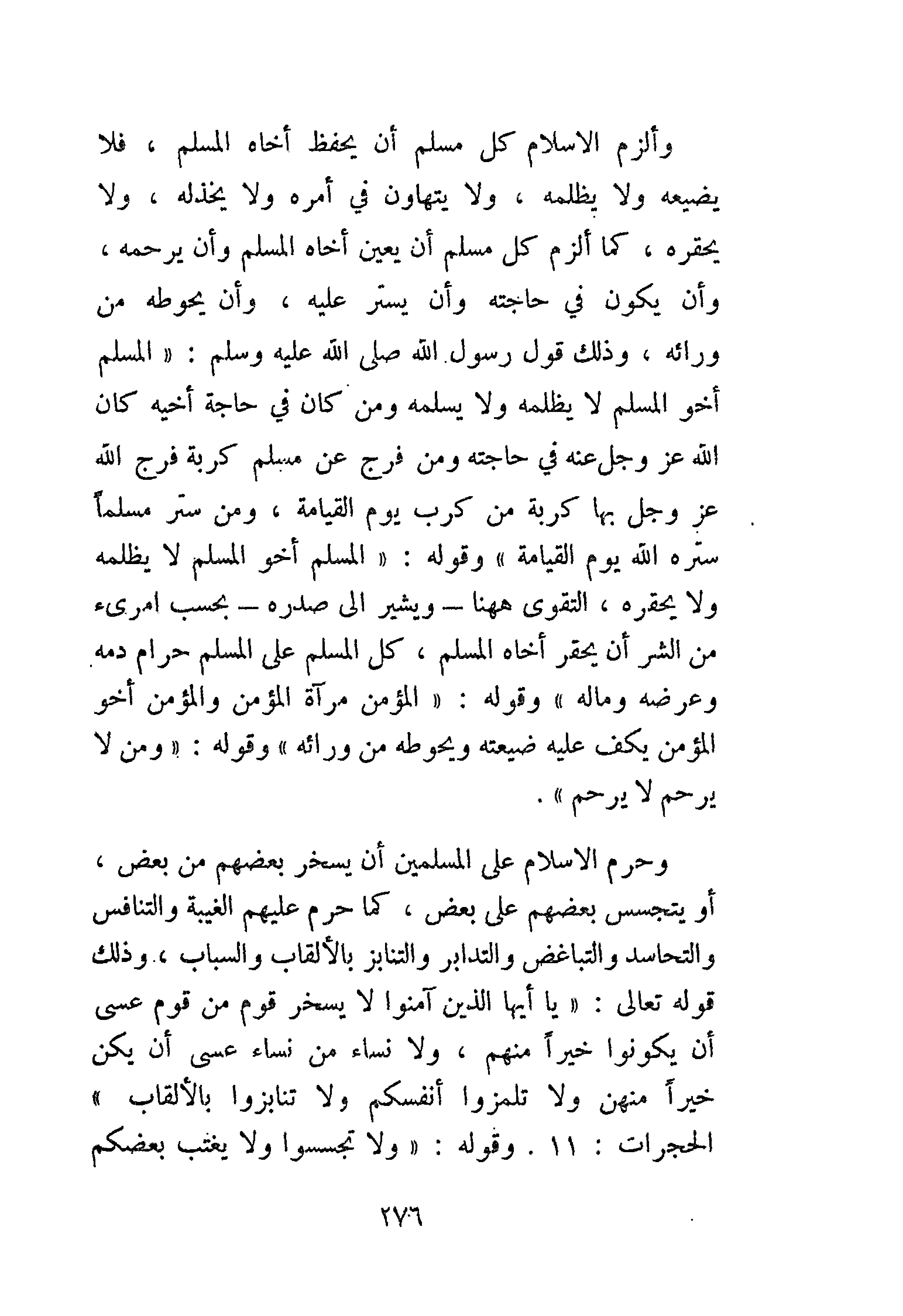 وألزم الإسلام كل مسلم أن يحفظ أخاه المسلم، فلا يضيعه ولا يظلمه، ولا يتهاون في أمره ولا يخذله، ولا يحقره، كما ألزم كل مسلم أن يعين أخاه المسلم وأن يرحمه، وأن يكون في حاجته أن يستر عليه، وأن يحوطه من ورائه، وذلك قول رسول الله - صَلََّى اللهُ عَلَيْهِ وَسَلَّمَ -: «المُسْلِمُ أَخُو المُسْلِمِ، لاَ يَظْلِمُهُ وَلاَ يُسْلِمُهُ، مَنْ كَانَ فِي حَاجَةِ أَخِيهِ، كَانَ اللَّهُ عَزَّ وَجَلَّ فِي حَاجَتِهِ، وَمَنْ فَرَّجَ عَنْ مُسْلِمٍ كُرْبَةً، فَرَّجَ اللَّهُ عَزَّ وَجَلَّ عَنْهُ بِهَا كُرْبَةً مِنْ كُرَبِ يَوْمِ القِيَامَةِ، وَمَنْ سَتَرَ مُسْلِمًا سَتَرَهُ اللَّهُ يَوْمَ القِيَامَةِ»، وقوله: «المُسْلِمُ أَخُو المُسْلِمِ، لاَ يَظْلِمُهُ، وَلاَ يَحْقِرُهُ، وَلاَ يَخْذُلُهُ، كُلُّ المُسْلِمِ عَلَى المُسْلِمِ حَرَامٌ دَمُهُ وَمَالُهُ، وَعِرْضُهُ - التَّقْوَى هَاهُنَا، التَّقْوَى هَاهُنَا، التَّقْوَى هَاهُنَا، يُشِيرُ إِلَى صَدْرِهِ ثَلَاثًا، بِحَسْبُ امْرِئٍ مِنَ الشَّرِّ أَنْ يَحْقِرَ أَخَاهُ المُسْلِمَ»، وقوله: «المُؤْمِنُ مِرْآةُ المُؤْمِنِ، وَالمُؤْمِنُ أَخُو المُؤْمِنِ، يَكُفُّ عَلَيْهِ ضَيْعَتَهُ، وَيَحُوطُهُ مِنْ وَرَائِهِ»، وقوله: «مَنْ لاَ يَرْحَمْ لاَ يُرْحَمْ».