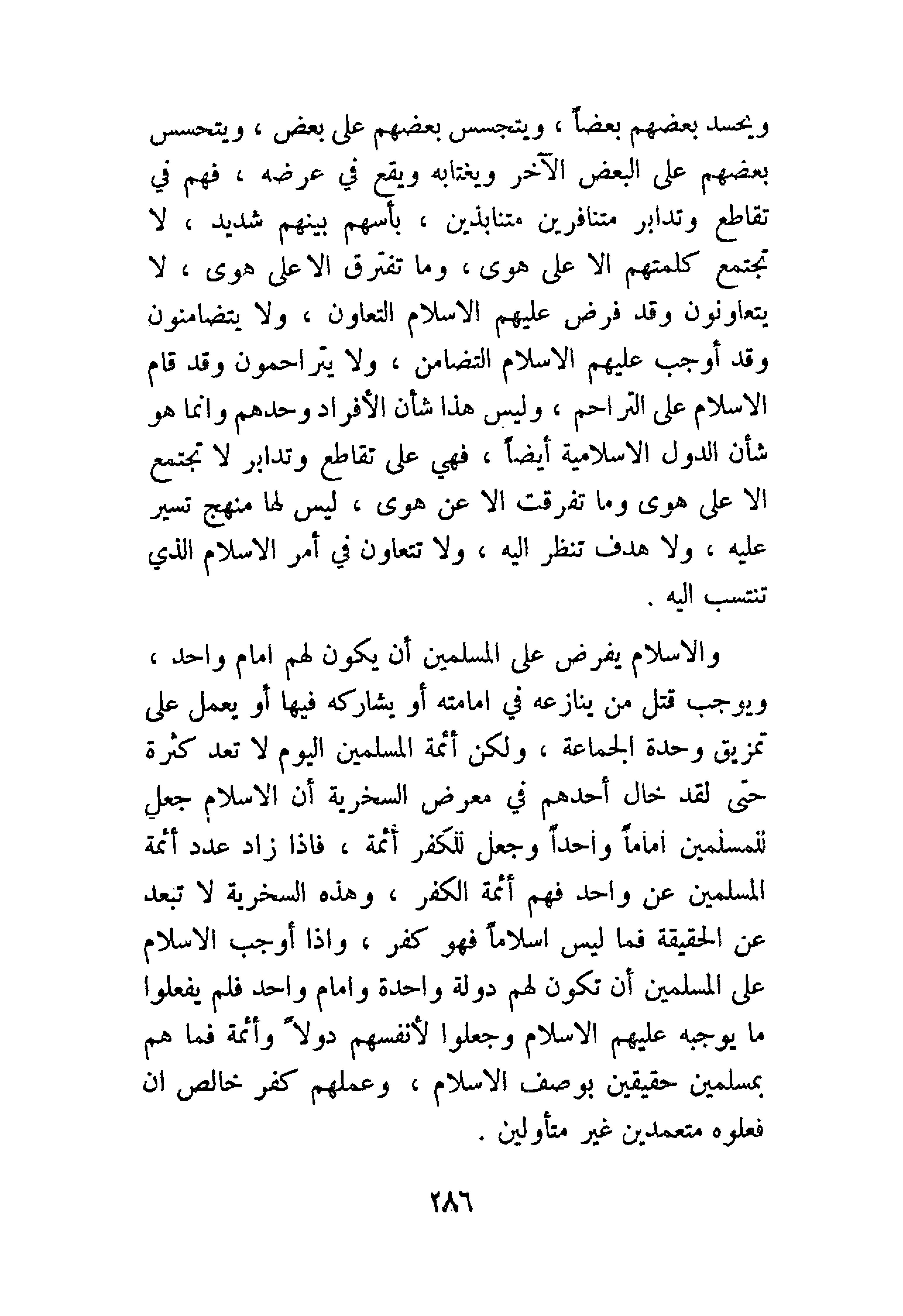 والإسلام يفرض على المسلمين أن يكون لهم إمام واحد، ويوجب قتل من ينازعه في إمامته أو يشاركه فيها أو يعمل على تمزيق وحدة الجماعة، ولكن أئمة المسلمين اليوم لا تعد كثرة حتى لقد خال أحدهم في معرض السخرية أن الإسلام جعل للمسلمين إمامًا واحدًا وجعل للكفر أئمة، فإذا زاد عدد أئمة المسلمين عن واحد فهم أئمة الكفر، وهذه السخرية لا تبعد عن الحقيقة فما ليس إسلامًا فهو كفر، وإذا أوجب الإسلام على المسلمين أن تكون لهم دولة واحدة وإمام واحد فلم يفعلوا ما يوجبه عليهم إسلامهم وجعلوا لأنفسهم دولاً وأئمة فما هم بمسلمين حقيقين بوصف الإسلام، وعملهم كفر خالص إن فعلوه متعمدين غير متأولين.