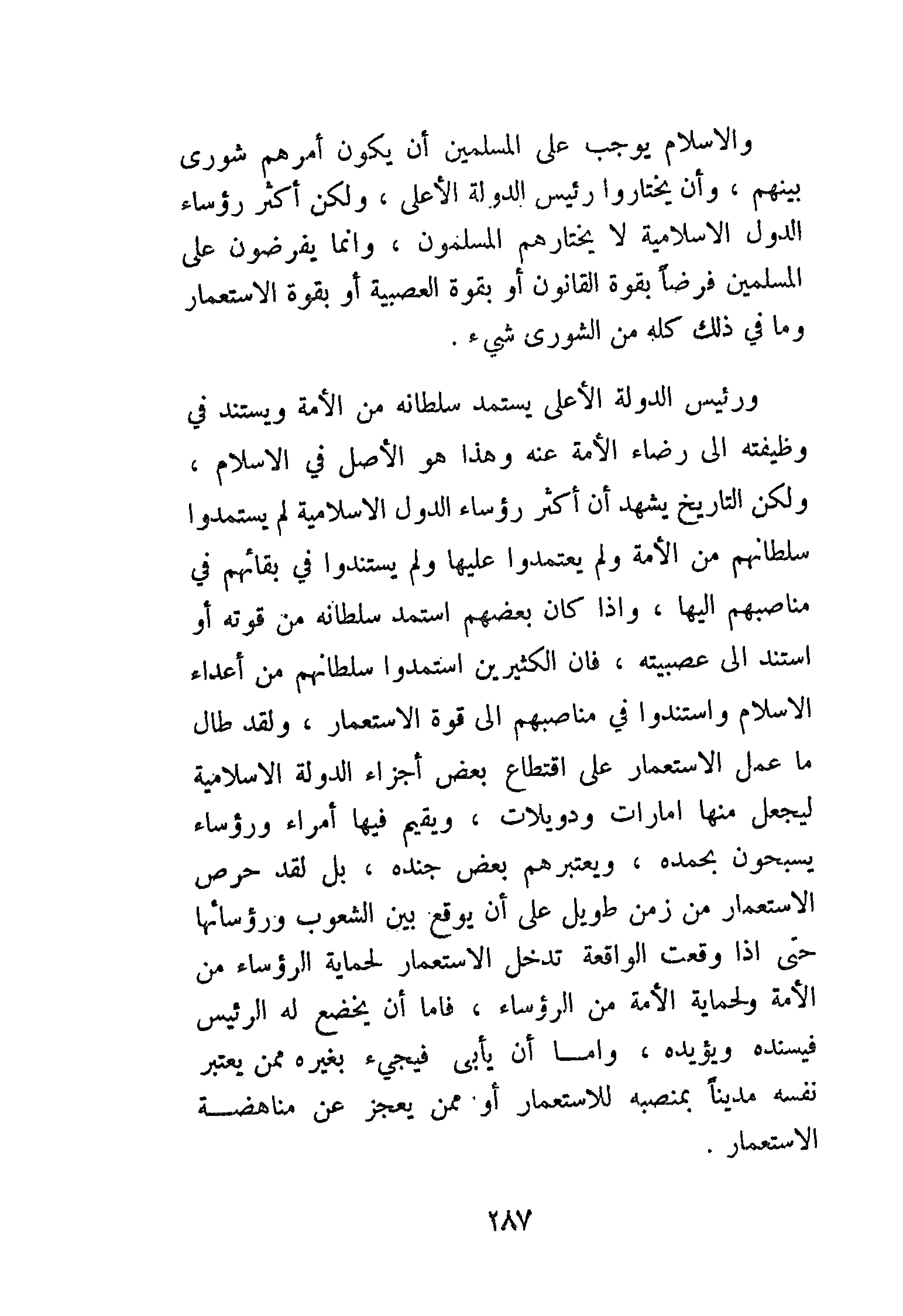 والإسلام يوجب على المسلمين أن يكون أمرهم شورى بينهم، وأن يختاروا رئيس الدولة الأعلى، ولكن أكثر رؤساء الدول الإسلامية لا يختارهم المسلمون، إنما يفرضون على المسلمين فرضًا بقوة القانون أو بقوة العصبية أو بقوة الاستعمار وما في ذلك كله من الشورى شيء.
