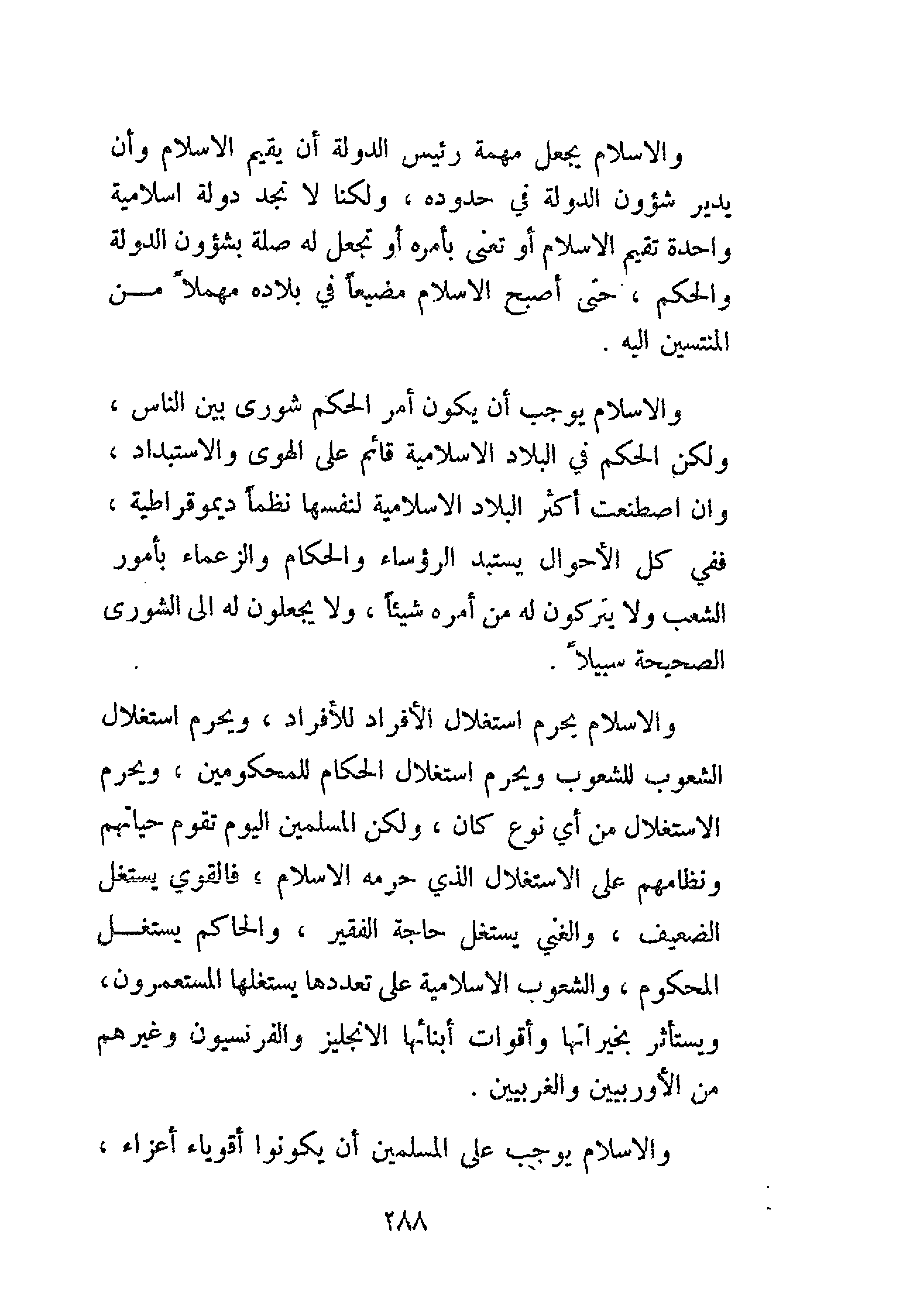والإسلام يجعل مهمة رئيس الدولة أن يقيم الإسلام وأن يدير شؤون الدولة في حدوده، ولكنا لا نجد دولة إسلامية واحدة تقيم الإسلام أو تعنى بأمره أو تجعل له صلة بشؤون الدولة والحكم، حتى أصبح الإسلام مضيعًا في بلاده مهملاً من المنتسبين إليه.