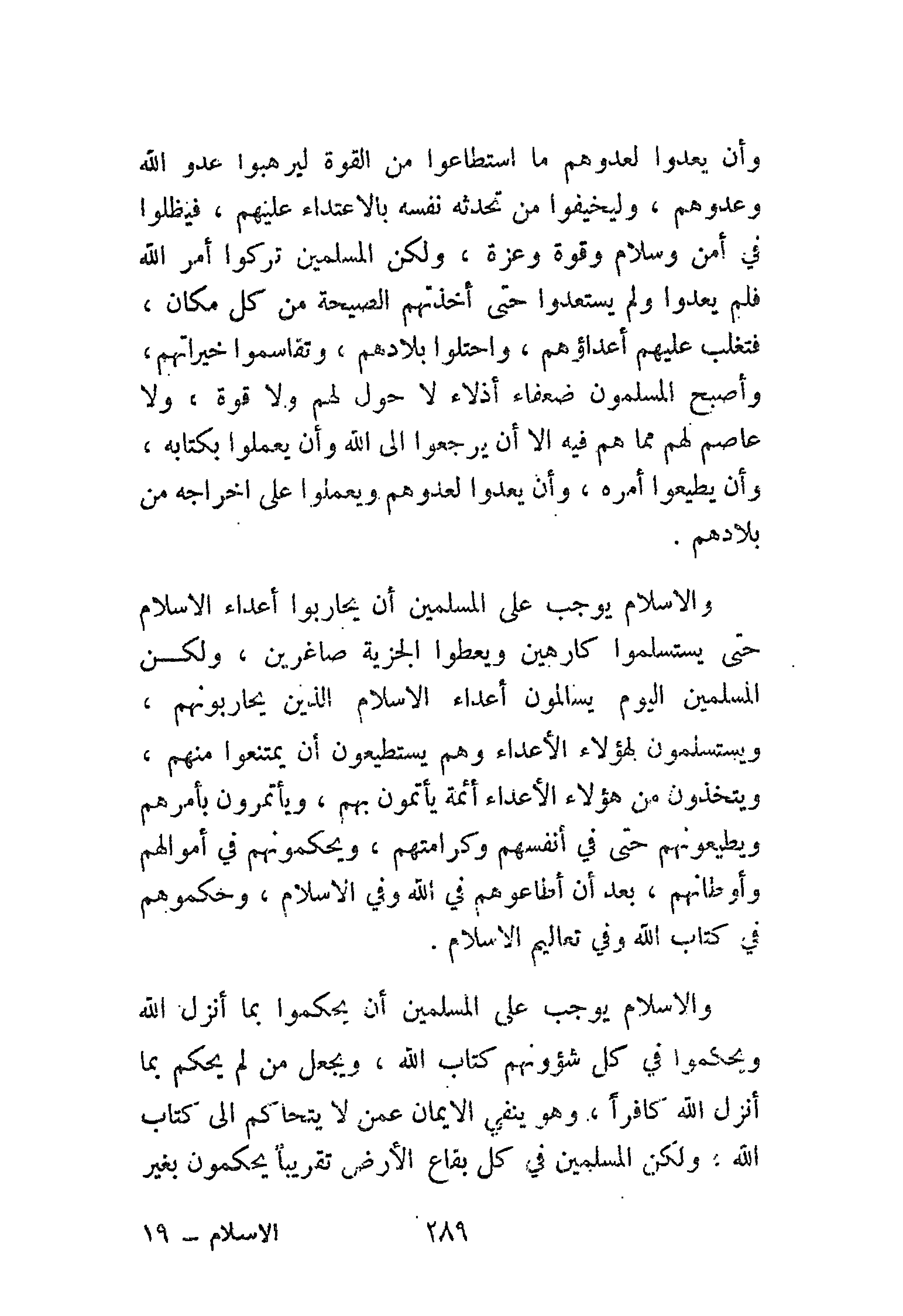 والإسلام يوجب على المسلمين أن يحاربوا أعداء الإسلام حتى يستسلموا كارهين ويعطوا الجزية صاغرين، ولكن المسلمين اليوم يسالمون أعداء الإسلام الذين يحاربونهم ويستسلمون لهاؤلاء الأعداء وهم يستطيعون أن يمتنعوا منهم، ويتخذون من هؤلاء الأعداء أئمة يأتون بهم ويأتمرون بأمرهم، ويطيعونهم حتى في أنفسهم وكرامتهم، ويحكمونهم في أموالهم وأوطانهم، بعد أن أطاعوهم في الله وفي الإسلام، وحكموهم في كتاب الله وفي تعاليم الإسلام.
