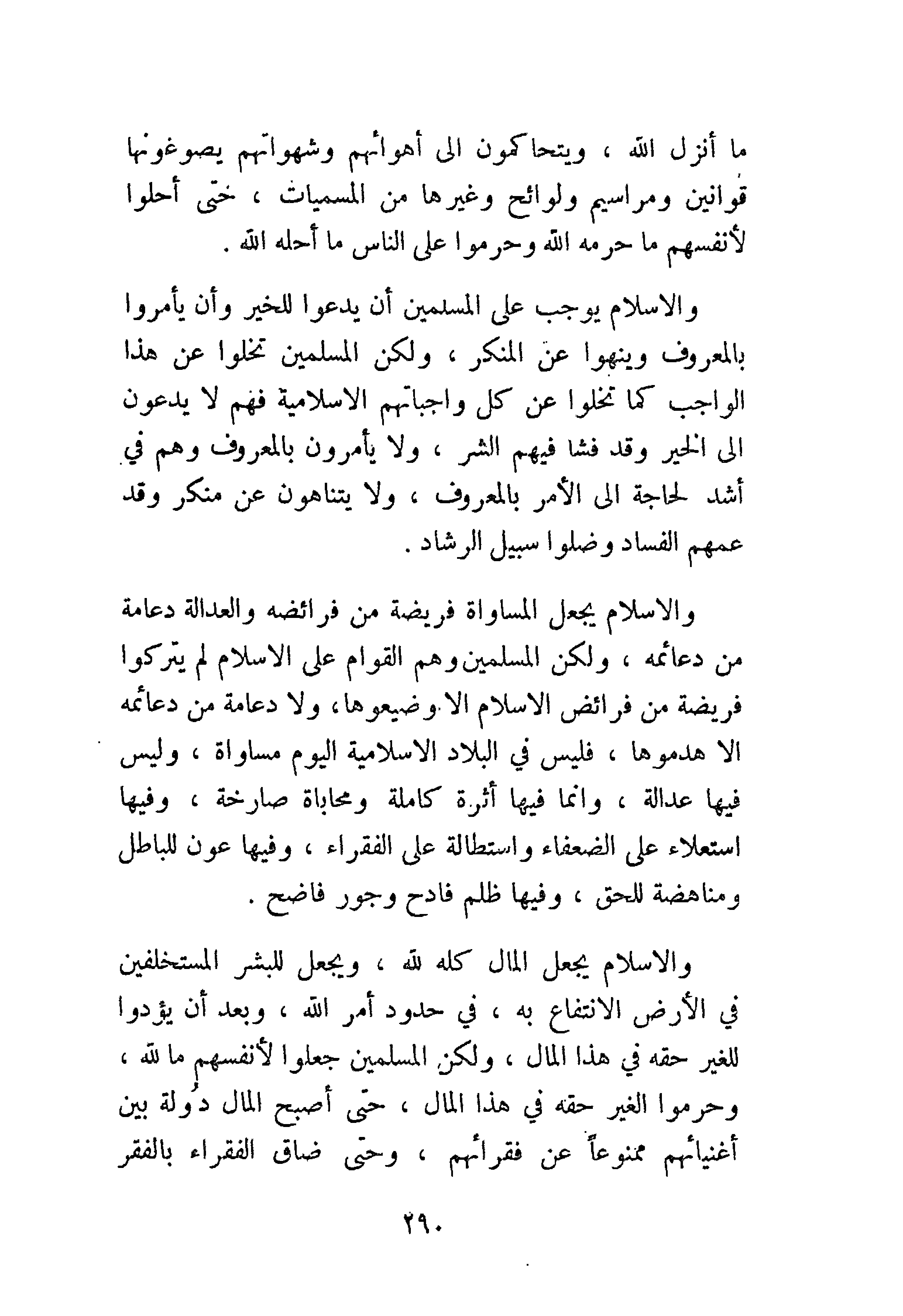 والإسلام يجعل المساواة فريضة من فرائضه والعدالة دعامة من دعائمه، ولكن المسلمين وهو القوام على الإسلام لم يتركوا فريضة من فرائض الإسلام إلا وضعوها، ولا دعامة من دعائمه إلا هدموها، فليس في البلاد الإسلامية اليوم مساواة، وليس فيها عدالة، وإنما فيها أثرة كاملة ومحاباة صارخة، وفيها استعلاء على الضعفاء واستطالة على الفقراء، وفيها عون للباطل ومناهضة للحق، وفيها ظلم فادح وجور فاضح.