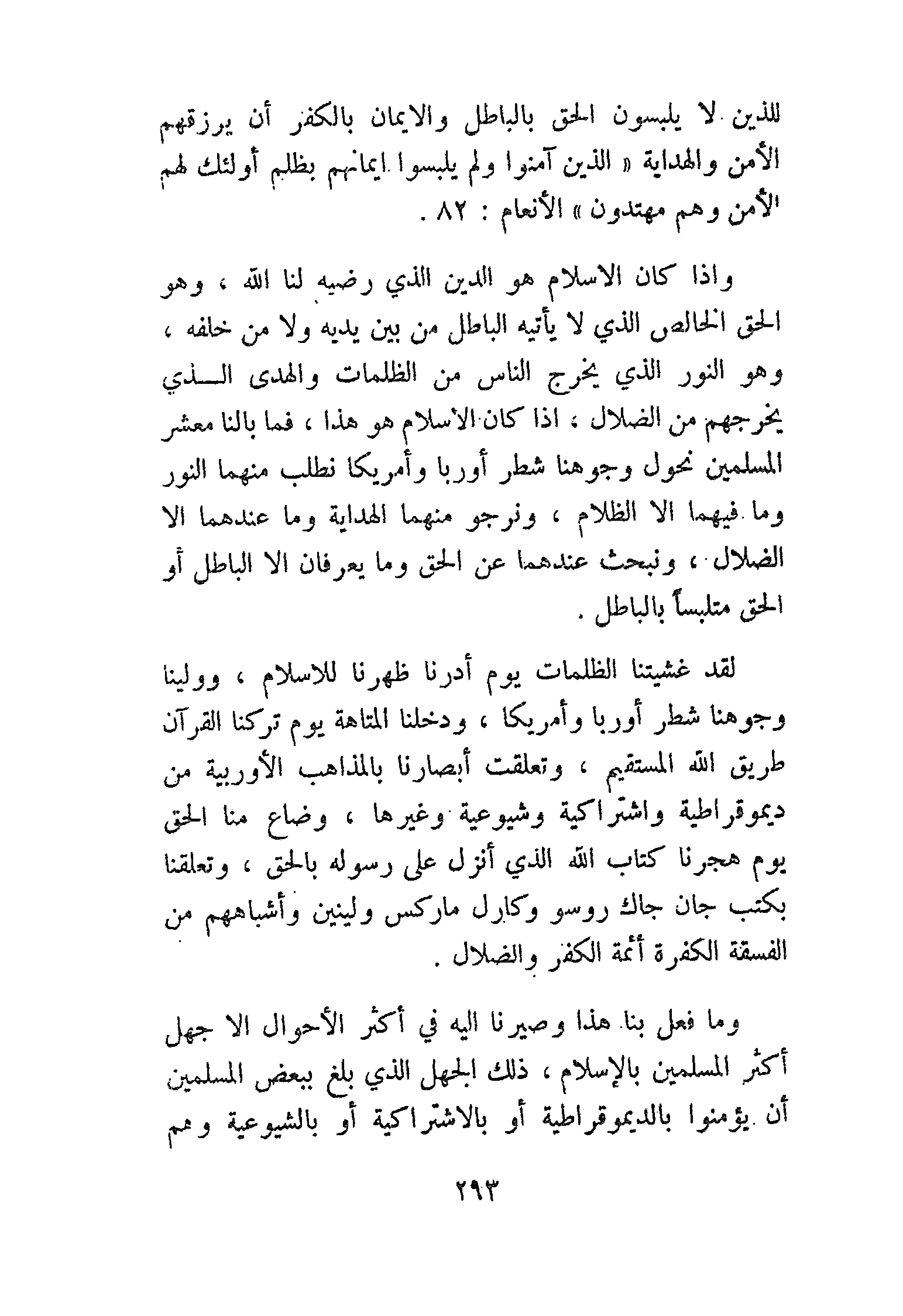 لقد غشيتنا الظلمات يوم أدرنا ظهرنا للإسلام، وولينا وجوهنا شطر أوروبا وأمريكا، ودخلنا المتاهة يوم تركنا القرآن طريق الله المستقيم، وتعلقت أبصارنا بالمذاهب الأوروبية من ديموقراطية واشتراكية وشيوعية وغيرها، وضاع منا الحق يوم هجرنا كتاب الله الذي أنزله على رسوله بالحق، وتعلقنا بكتب جان جاك روسو وكارل ماركس ولينين وأشباههم من الفسقة الكفرة أئمة الكفر والضلال.