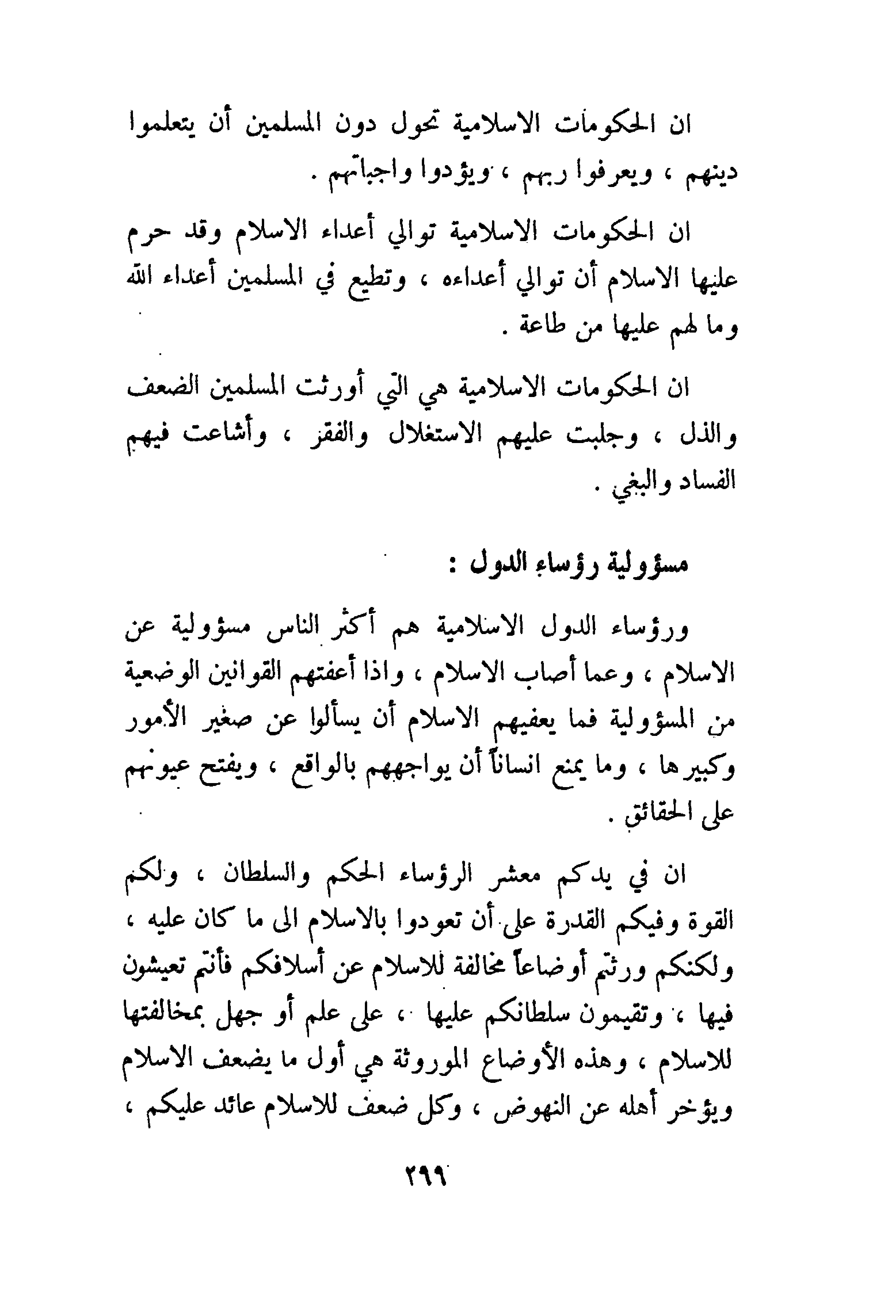 ورؤساء الدول الإسلامية هم أكثر الناس مسؤولية عن الإسلام، وعما أصاب الإسلام، وإذا أعفتهم القوانين الوضعية من المسؤولية فما يعفيهم الإسلام أن يسألوا عن صغير الأمور وكبيرها، وما يمنع إنسانًا أن يواجههم بالواقع، ويفتح عيونهم على الحقائق.