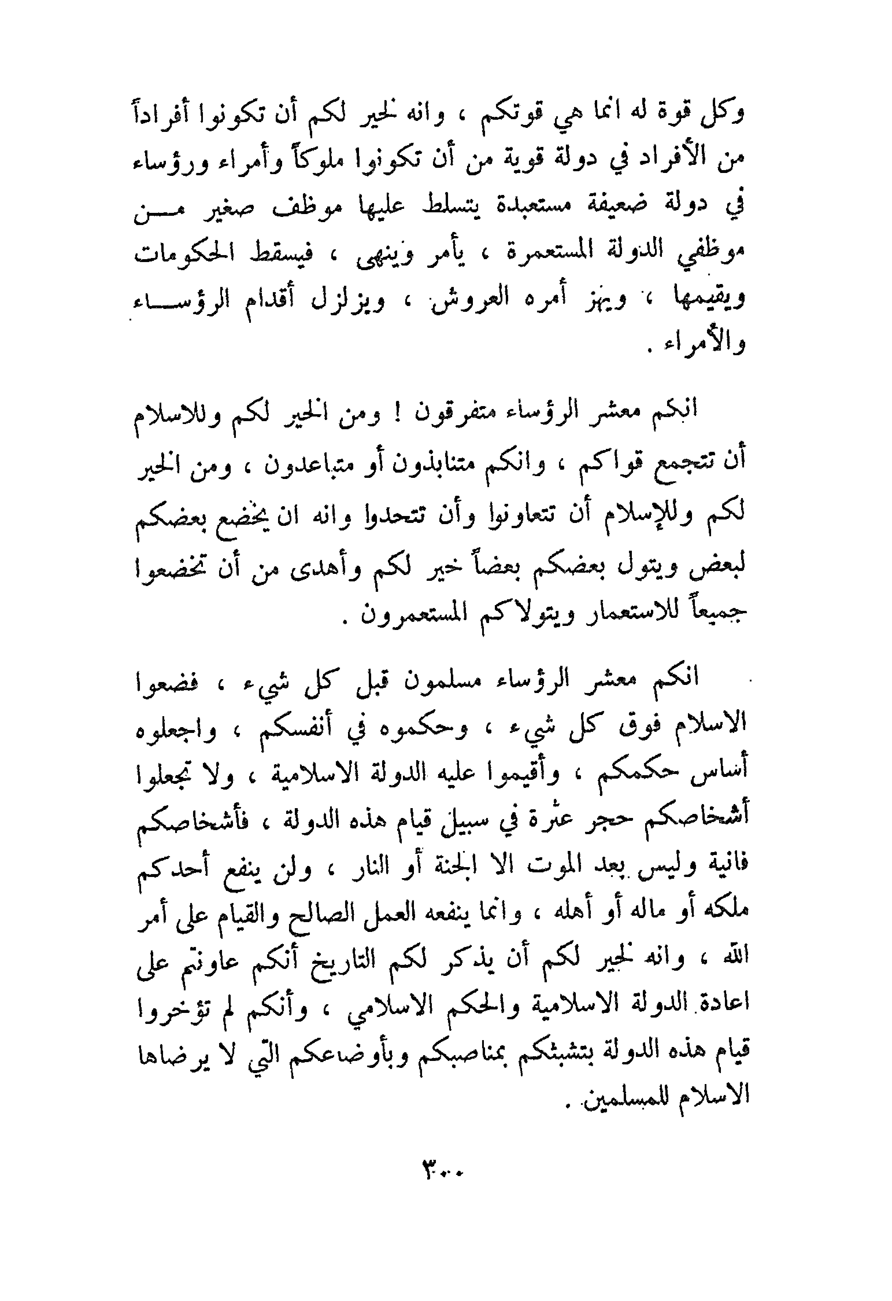 إنكم معشر الرؤساء مسلمون من قبل كل شيء، فضعوا الإسلام فوق كل شيء، وحكموه في أنفسكم، واجعلوه أساس حكمكم، وأقيموا عليه الدولة الإسلامية، ولا تجعلوا أشخاصكم حجر عثرة في سبيل قيام هذه الدولة، فأشخاصكم فانية وليس بعد الموت إلا الجنة أو النار، ولن ينفع أحدكم ملكه أو ماله أو أهله، إنما ينفعه العمل الصالح والقيام على أمر الله، وإنه لخير لكم أن يذكر لكم التاريخ أنكم عاونتم على إعادة الدولة الإسلامية والحكم الإسلامي، وإنكم لم تؤخروا قيام هذه الدولة بتشبثكم بمناصبكم وبأوضاعكم التي لا يرضاها الإسلام للمسلمين.