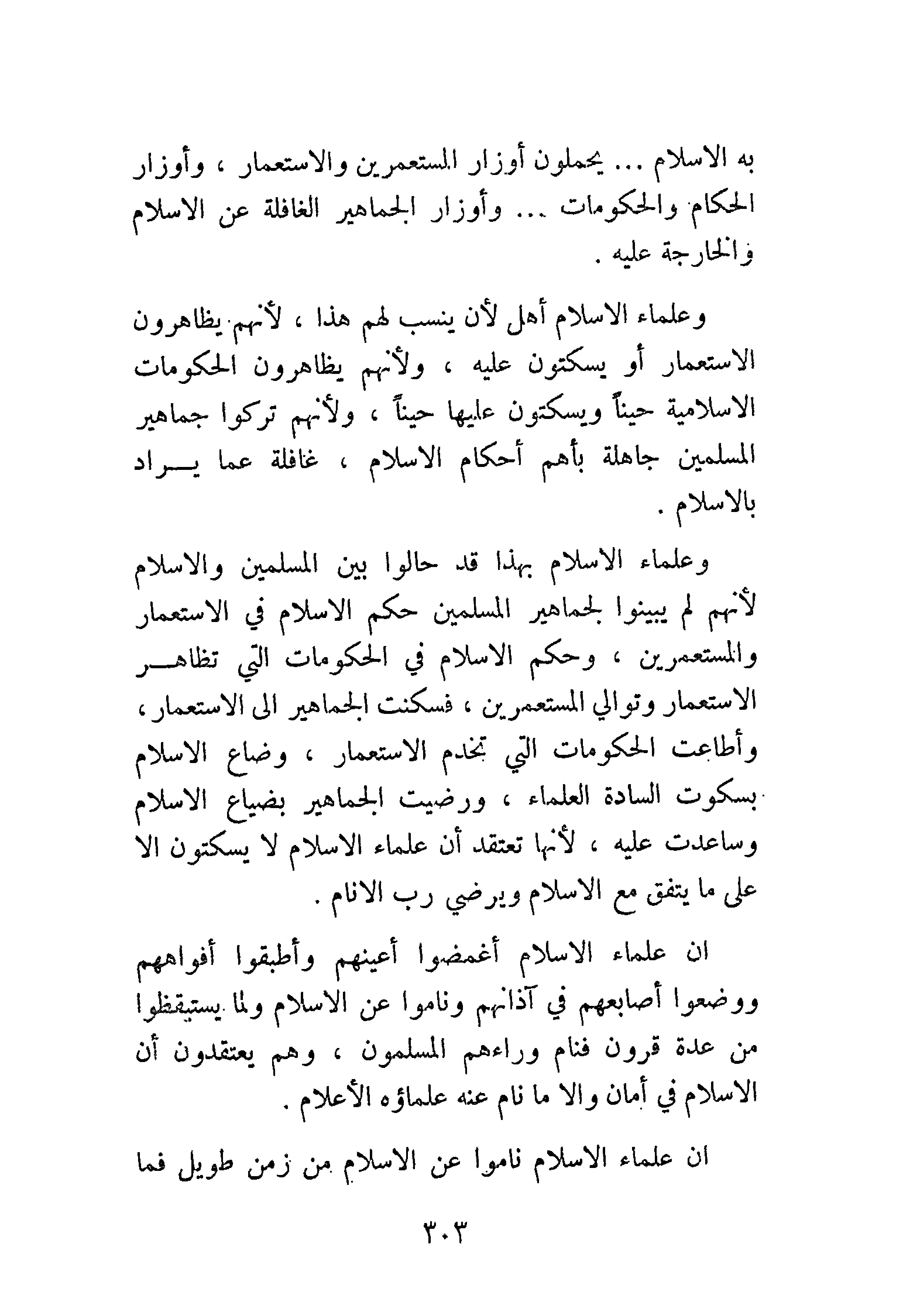 إن علماء الإسلام أغمضوا أعينهم وأطبقوا أفواههم ووضعوا أصابعهم في آذانهم وناموا عن الإسلام ولما استيقظوا من عدة قرون فنام وراءهم المسلمون، وهم يعتقدون أن الإسلام في أمان وإلا ما نام عنه علماؤه الأعلام.
