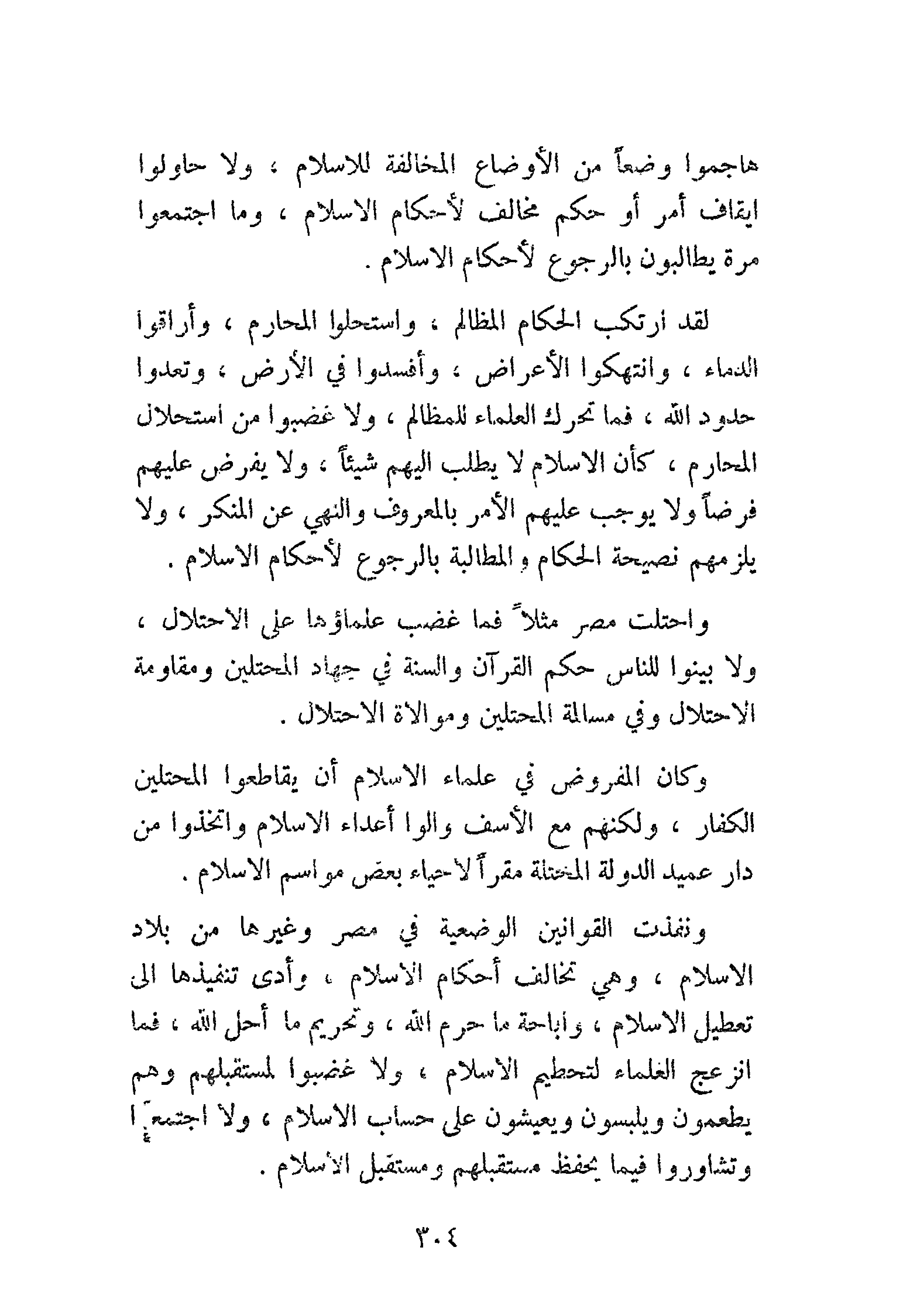 واحتلت مصر مثلاً فما غضب علماؤها على الاحتلال، ولا بينوا للناس حكم القرآن والسنة في جهاد المحتلين ومقاومة الاحتلال وفي مسألة المحتلين وموالاة الاحتلال.