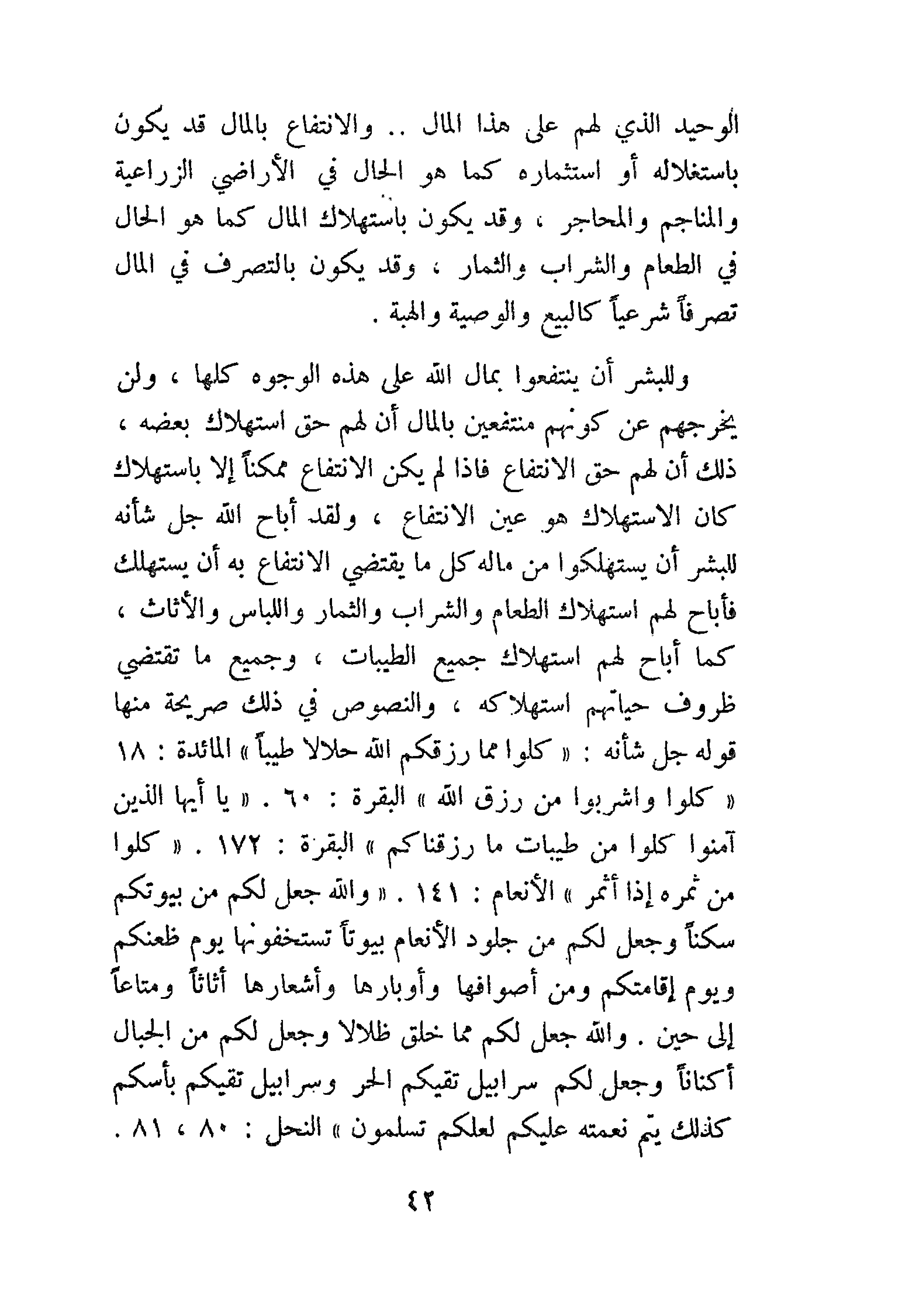 وللبشر أن ينتفعوا بمال الله على هذه الوجوه كلها، ولن يخرجهم عن كونهم منتفعين بالمال أن لهم حق استهلاك بعضه، ذلك أن لهم حق الانتفاع فإذا لم يكن الانتفاع ممكنًا إلا بالاستهلاك كان الاستهلاك هو عين الانتفاع، ولقد أباح الله - جَلَّ شَأْنُهُ - للبشر أن يستهلكوا من ماله كل ما يقتضي الانتفاع به أن يستهلك، فأباح لهم استهلاك الطعام والشراب والثمار واللباس والأثاث، كما أباح لهم استهلاك جميع الطيبات، وجميع ما تقتضي ظروف حياتهم استهلاكه، والنصوص في ذلك صريحة منها قوله - جَلَّ شَأْنُهُ -: {وَكُلُوا مِمَّا رَزَقَكُمُ اللَّهُ حَلاَلاً طَيِّبًا} [المائدة: 88]. {كُلُوا وَاشْرَبُوا مِنْ رِزْقِ اللَّهِ} [البقرة: 60]. {يَا أَيُّهَا الَّذِينَ آمَنُوا كُلُوا مِنْ طَيِّبَاتِ مَا رَزَقْنَاكُمْ} [البقرة: 172]. {كُلُوا مِنْ ثَمَرِهِ إِذَا أَثْمَرَ} [الأنعام: 141]. {وَاللَّهُ جَعَلَ لَكُمْ مِنْ بُيُوتِكُمْ سَكَنًا وَجَعَلَ لَكُمْ مِنْ جُلُودِ الأَنْعَامِ بُيُوتًا تَسْتَخِفُّونَهَا يَوْمَ ظَعْنِكُمْ وَيَوْمَ إِقَامَتِكُمْ وَمِنْ أَصْوَافِهَا وَأَوْبَارِهَا وَأَشْعَارِهَا أَثَاثًا وَمَتَاعًا إِلَى حِينٍ، وَاللَّهُ جَعَلَ لَكُمْ مِمَّا خَلَقَ ظِلاَلاً وَجَعَلَ لَكُمْ مِنَ الْجِبَالِ أَكْنَانًا وَجَعَلَ لَكُمْ سَرَابِيلَ تَقِيكُمُ الْحَرَّ وَسَرَابِيلَ تَقِيكُمْ بَأْسَكُمْ كَذَلِكَ يُتِمُّ نِعْمَتَهُ عَلَيْكُمْ لَعَلَّكُمْ تُسْلِمُونَ} [النحل: 80، 81].