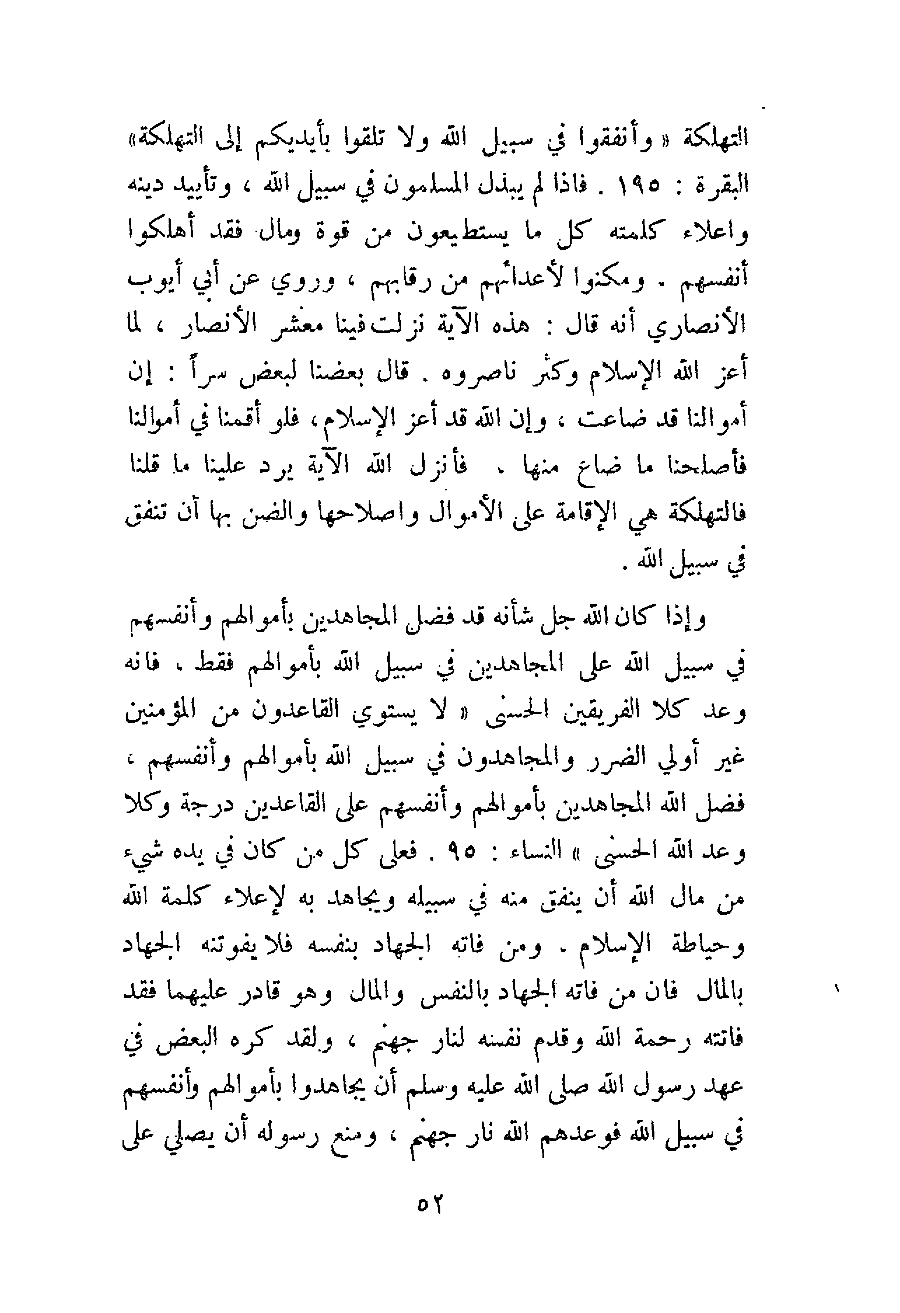وإذا كان الله - جَلَّ شَأْنُهُ - قد فضل المجاهدين بأموالهم وأنفسهم في سبيل الله على المجاهدين في سبيل الله بأموالهم فقط، فإنه وعد كلا الفريقين الحسنى {لاَ يَسْتَوِي الْقَاعِدُونَ مِنَ الْمُؤْمِنِينَ غَيْرُ أُولِي الضَّرَرِ وَالْمُجَاهِدُونَ فِي سَبِيلِ اللَّهِ بِأَمْوَالِهِمْ وَأَنْفُسِهِمْ فَضَّلَ اللَّهُ الْمُجَاهِدِينَ بِأَمْوَالِهِمْ وَأَنْفُسِهِمْ عَلَى الْقَاعِدِينَ دَرَجَةً وَكُلاًّ وَعَدَ اللَّهُ الْحُسْنَى} [النساء: 95]. فعلى كل من كان في يده شيء من مال الله أن ينفق منه في سبيله ويجاهد به لإعلاء كلمة الله وحياطة الإسلام، ومن فاته الجهاد بنفسه فلا يفوته الجهاد بالمال، فإن من فاته الجهاد بالنفس والمال وهو قادر عليهما فقد فاتته رحمة الله وقدم نفسه لنار جهنم، ولقد كره البعض في عهد رسول رسول الله - صَلََّى اللهُ عَلَيْهِ وَسَلَّمَ - أن يجاهدوا بأموالهم وأنفسهم في سبيل الله فوعدهم الله نار جهنم، ومنع رسوله أن يصلي على
