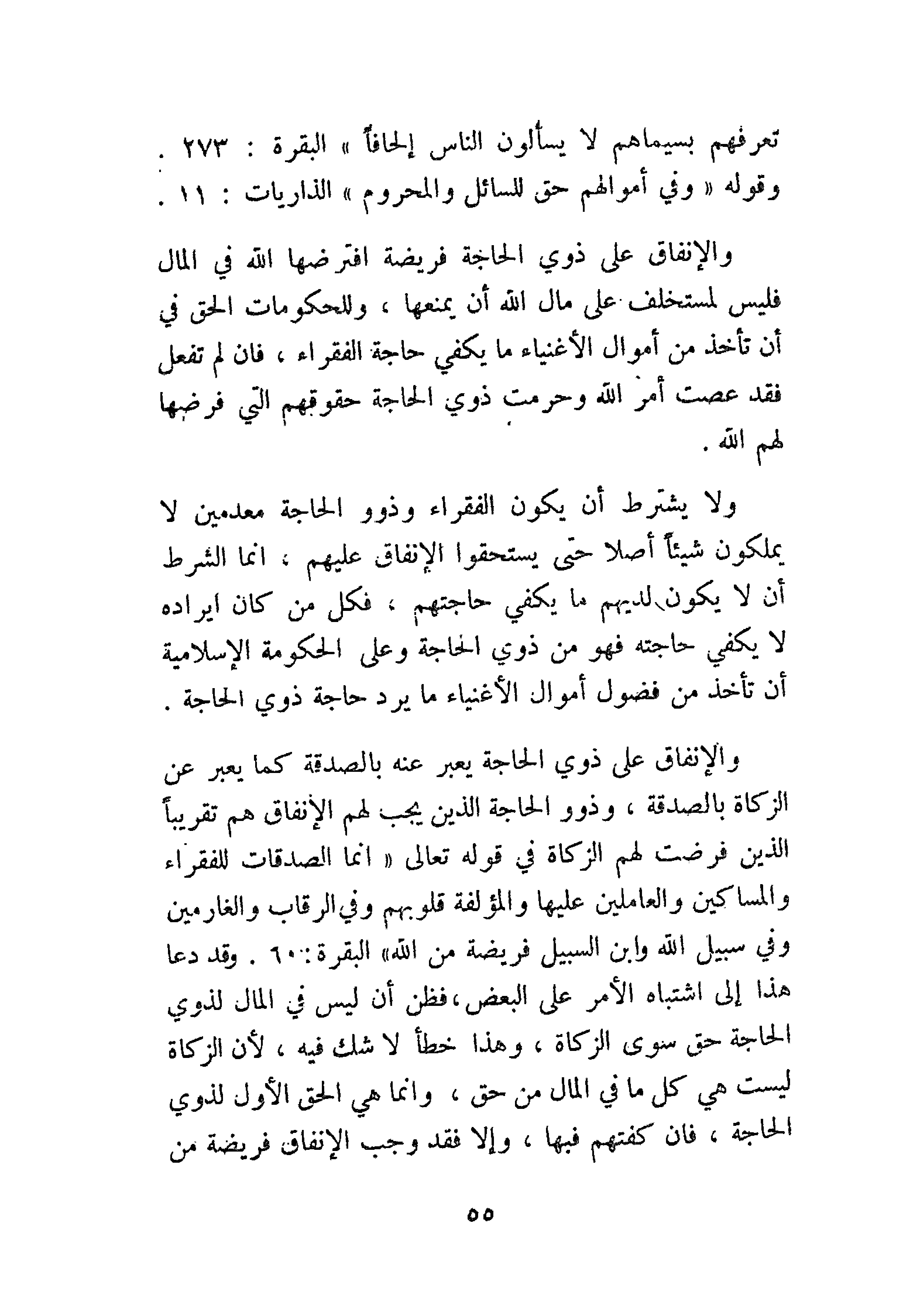 والإنفاق على ذوي الحاجة يعبر عنه بالصدقة كما يعبر عن الزكاة بالصدقة، وذوو الحاجة الذين يجب لهم الإنفاق هم تقريبًا الذين فرضت لهم الزكاة في قوله تعالى {إِنَّمَا الصَّدَقَاتُ لِلْفُقَرَاءِ وَالْمَسَاكِينِ وَالْعَامِلِينَ عَلَيْهَا وَالْمُؤَلَّفَةِ قُلُوبُهُمْ وَفِي الرِّقَابِ وَالْغَارِمِينَ وَفِي سَبِيلِ اللَّهِ وَابْنِ السَّبِيلِ فَرِيضَةً مِنَ اللَّهِ} [التوبة: 60]. وقد دعا هذا الى اشتباه الأمر على البعض، فظن أن ليس في المال لذوي الحاجة سوى الزكاة، وهذا خطأ لا شك فيه، لأن الزكاة ليست هي كل ما في المال من حق، وإنما هي الحق الأول لذي الحاجة، فإن كفتهم فبها، وإلا فقد وجب الإنفاق فريضة من