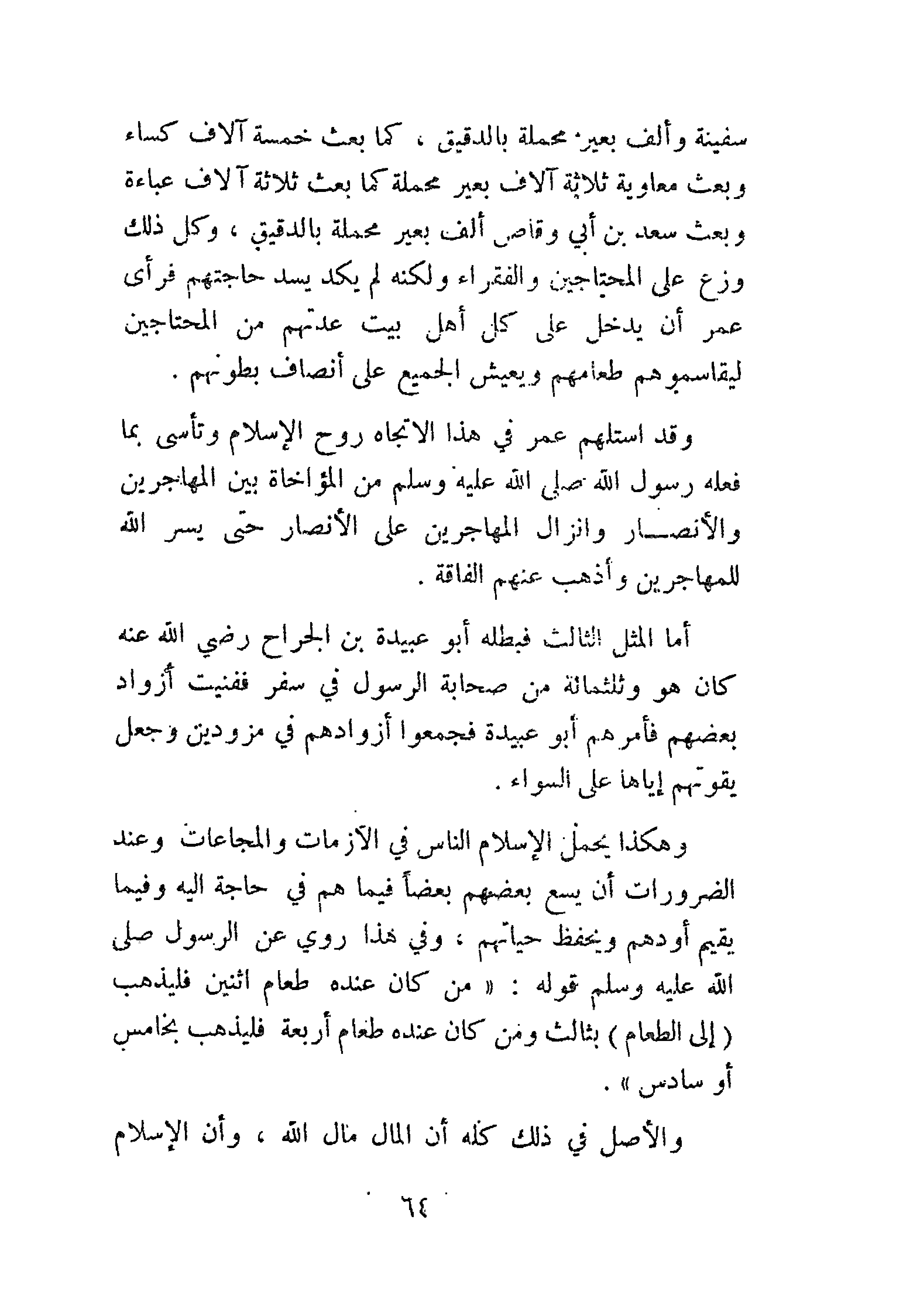 وقد استلهم عمر في هذا الاتجاه روح الإسلام وتأسى بما فعله رسول الله - صَلََّى اللهُ عَلَيْهِ وَسَلَّمَ - من المؤاخاة بين المهاجرين والأنصار وأنزل المهاجرين على الأنصار حتى يسر الله للمهاجرين وأذهب عنهم الفاقة.