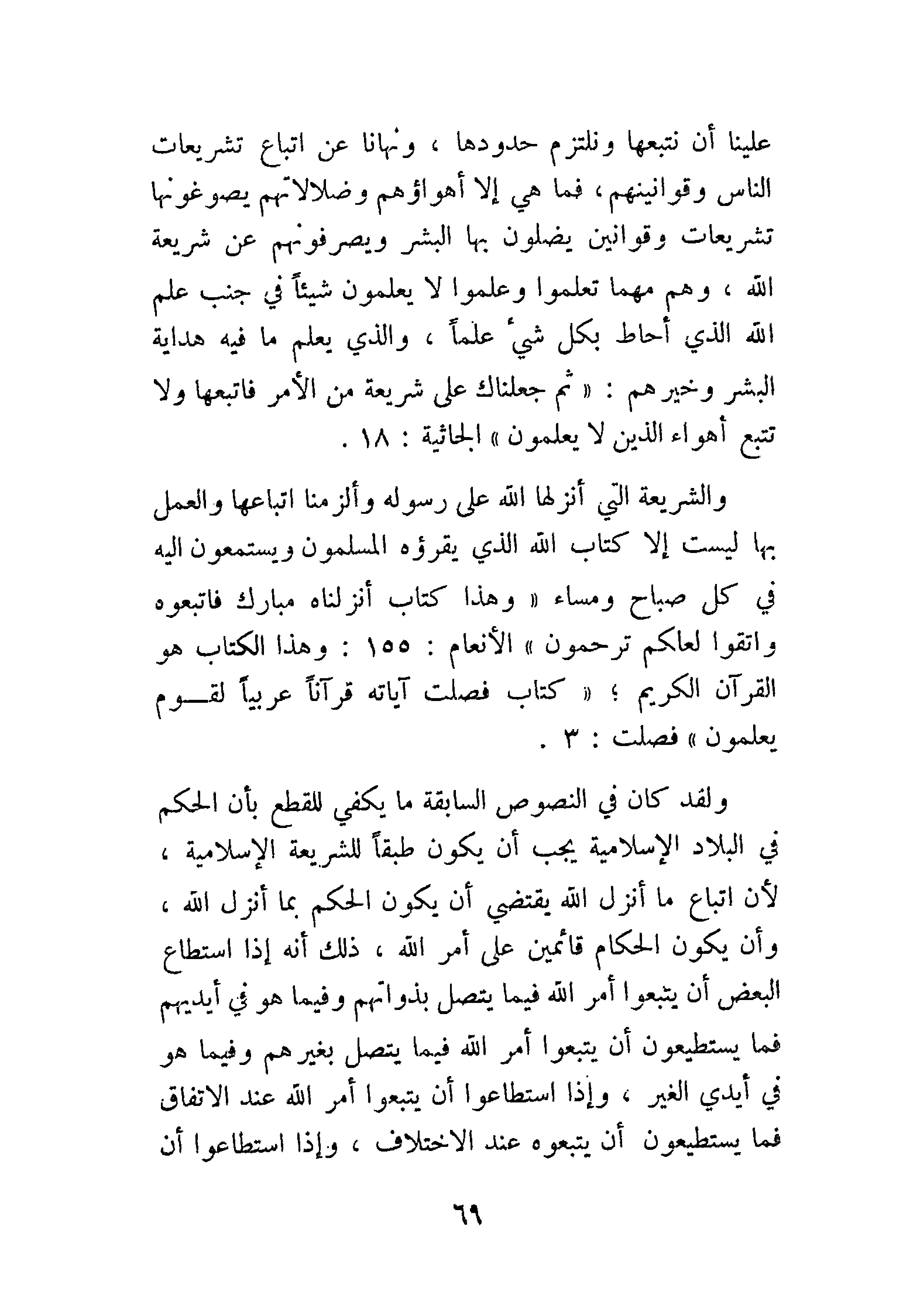 ولقد كان في النصوص السابقة ما يكفي للقطع بأن الحكم في البلاد الإسلامية يجب أن يكون طبقًا للشريعة الإسلامية، لأن اتباع ما أنزل الله يقتضي أن يكون الحكم بما أنزل الله، وأن يكون الحكام قائمين على أمر الله فيما يتصل بذواتهم وفيما هو في أيديهم فما يستطيعون أن يتبعوه عند الاختلاف، وإذا استطاعوا أن