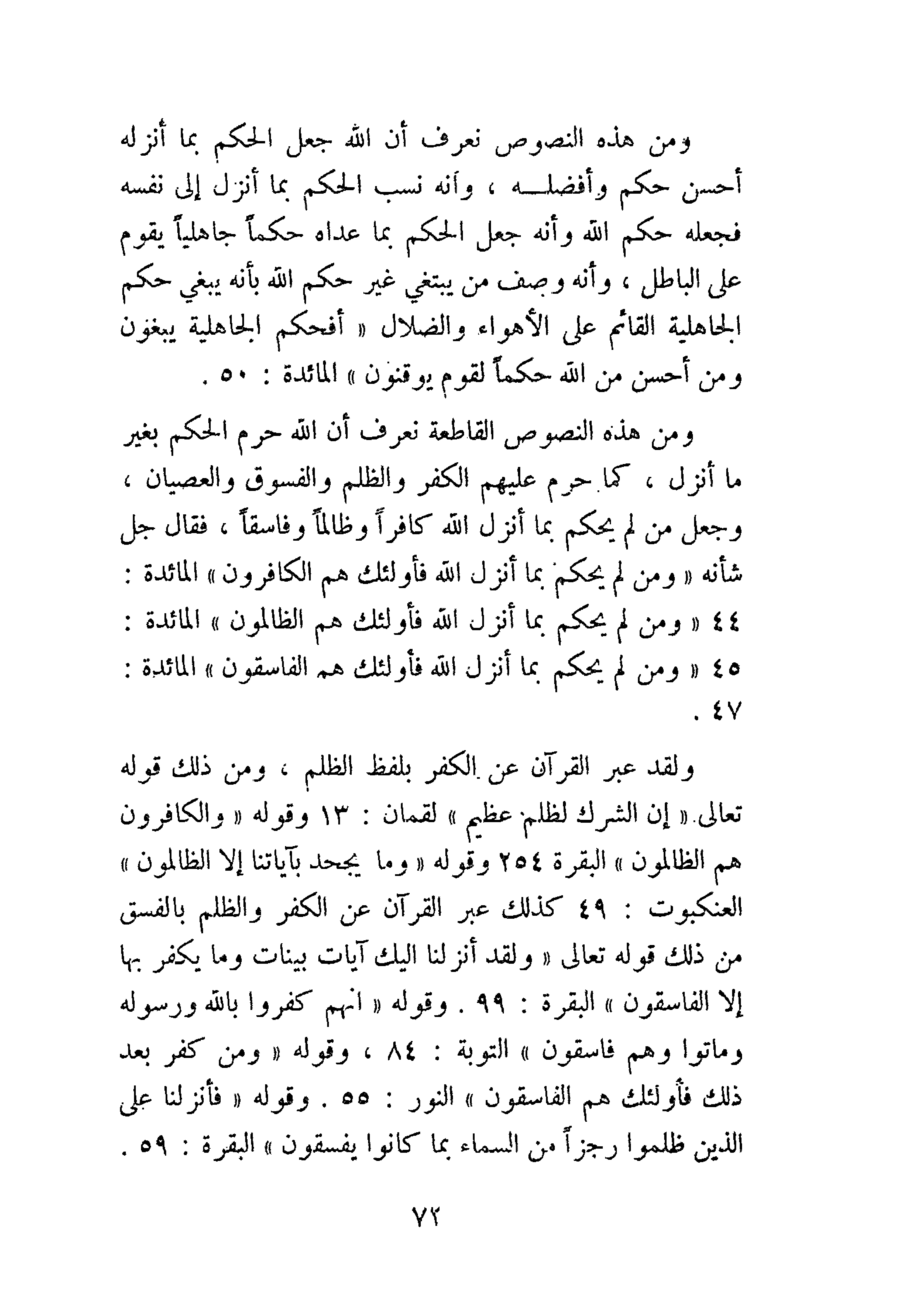 ومن هذه النصوص القاطعة نعرف أن الله حَرَّمَ الحكم بغير ما أنزل، كما حَرَّمَ عليهم الكفر والظلم والفسوق والعصيان، وجعل من لم يحكم بما أنزل الله كافرًا وظالمًا وفاسقًا، فقال - جَلَّ شَأْنُهُ - {وَمَنْ لَمْ يَحْكُمْ بِمَا أَنْزَلَ اللَّهُ فَأُولَئِكَ هُمُ الْكَافِرُونَ} [المائدة: 44]، {وَمَنْ لَمْ يَحْكُمْ بِمَا أَنْزَلَ اللَّهُ فَأُولَئِكَ هُمُ الظَّالِمُونَ} [المائدة: 45]، {وَمَنْ لَمْ يَحْكُمْ بِمَا أَنْزَلَ اللَّهُ فَأُولَئِكَ هُمُ الْفَاسِقُونَ} [المائدة: 47].