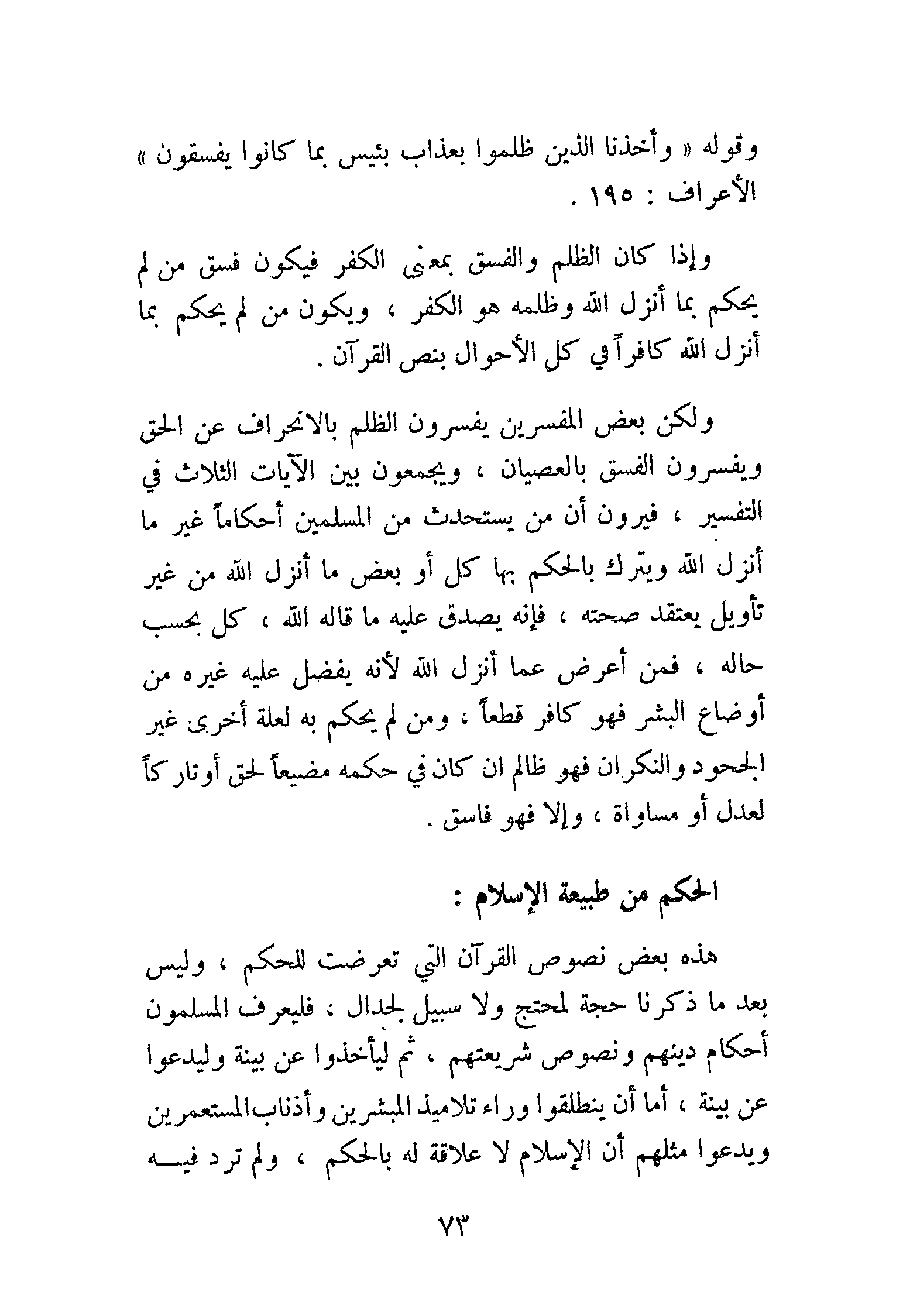 هذه بعض نصوص القرآن التي تعرضت للحكم، وليس بعد ما ذكرنا حُجَّةً لمحتج ولا سبيل لجدال، فليعرف المسلمون أحكام دينهم ونصوص شريعتهم، ثم ليأخذوا عن بَيِّنَةٍ وليدعوا عَنْ بَيِّنَةٍ، أما أن ينطلقوا وراء تلاميذ المبشرين وأذناب المستعمرين ويدعون مثلهم أن الإسلام لا علاقة له بالحكم، ولم ترد فيه