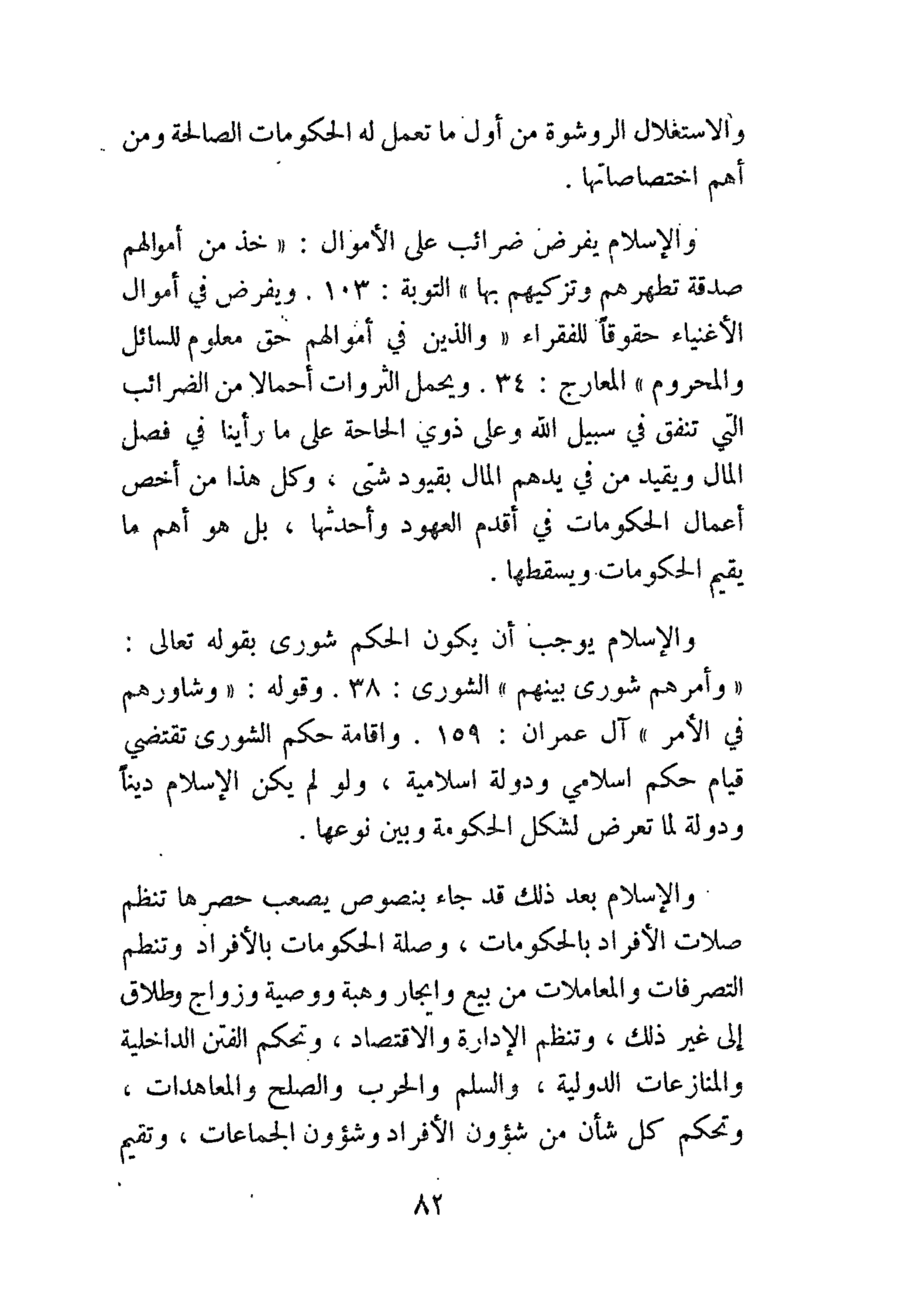 والإسلام يفرض ضرائب على الأموال: {خُذْ مِنْ أَمْوَالِهِمْ صَدَقَةً تُطَهِّرُهُمْ وَتُزَكِّيهِمْ بِهَ} [التوبة: 103]. ويفرض في أموال الأغنياء حقوقًا للفقراء {وَالَّذِينَ فِي أَمْوَالِهِمْ حَقٌّ مَعْلُومٌ، لِلسَّائِلِ وَالْمَحْرُومِ} [المعارج: 24، 25]. ويحمل الثروات أحمالاً من الضرائب التي تنفق في سبيل الله وعلى ذوي الحاجة على ما رأينا في فصل المال ويقيد من يدهم المال بقيود شتى، وكل هذا من أخص أعمال الحكومات في أقدم العهود وأحدثها بل هو أهم ما يقيم الحكومات ويسقطها.