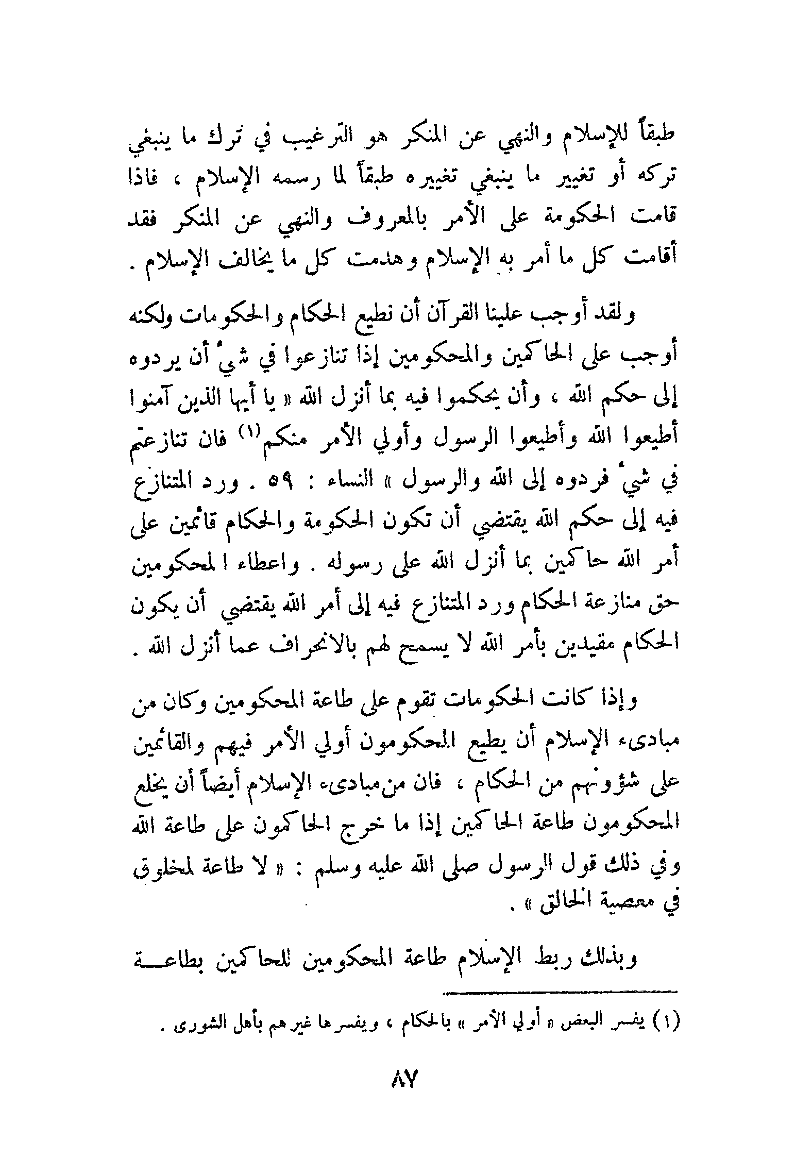 ولقد أوجب علينا القرآن أن نطيع الحكام والحكومات ولكنه أوجب على الحاكمين والمحكومين إذا تنازعوا في شيء أن يردوه إلى حكم الله، وأن يحكموا فيه بما أنزل الله {يَا أَيُّهَا الَّذِينَ آمَنُوا أَطِيعُوا اللَّهَ وَأَطِيعُوا الرَّسُولَ وَأُولِي الأَمْرِ مِنْكُمْ (¬1) فَإِنْ تَنَازَعْتُمْ فِي شَيْءٍ فَرُدُّوهُ إِلَى اللَّهِ وَالرَّسُولِ} [النساء: 59]. ورد المتنازع فيه إلى حكم الله يقتضي أن تكون الحكومة والحكام قائمين على أمر الله حاكمين بما أنزل الله على رسوله. وإعطاء المحكومين حق منازعة الحكام ورد المتنازع فيه إلى أمر الله يقتضي أن يكون الحكام مقيدين بأمر الله لا يسمح لهم بالانحراف عما أنزل الله.
