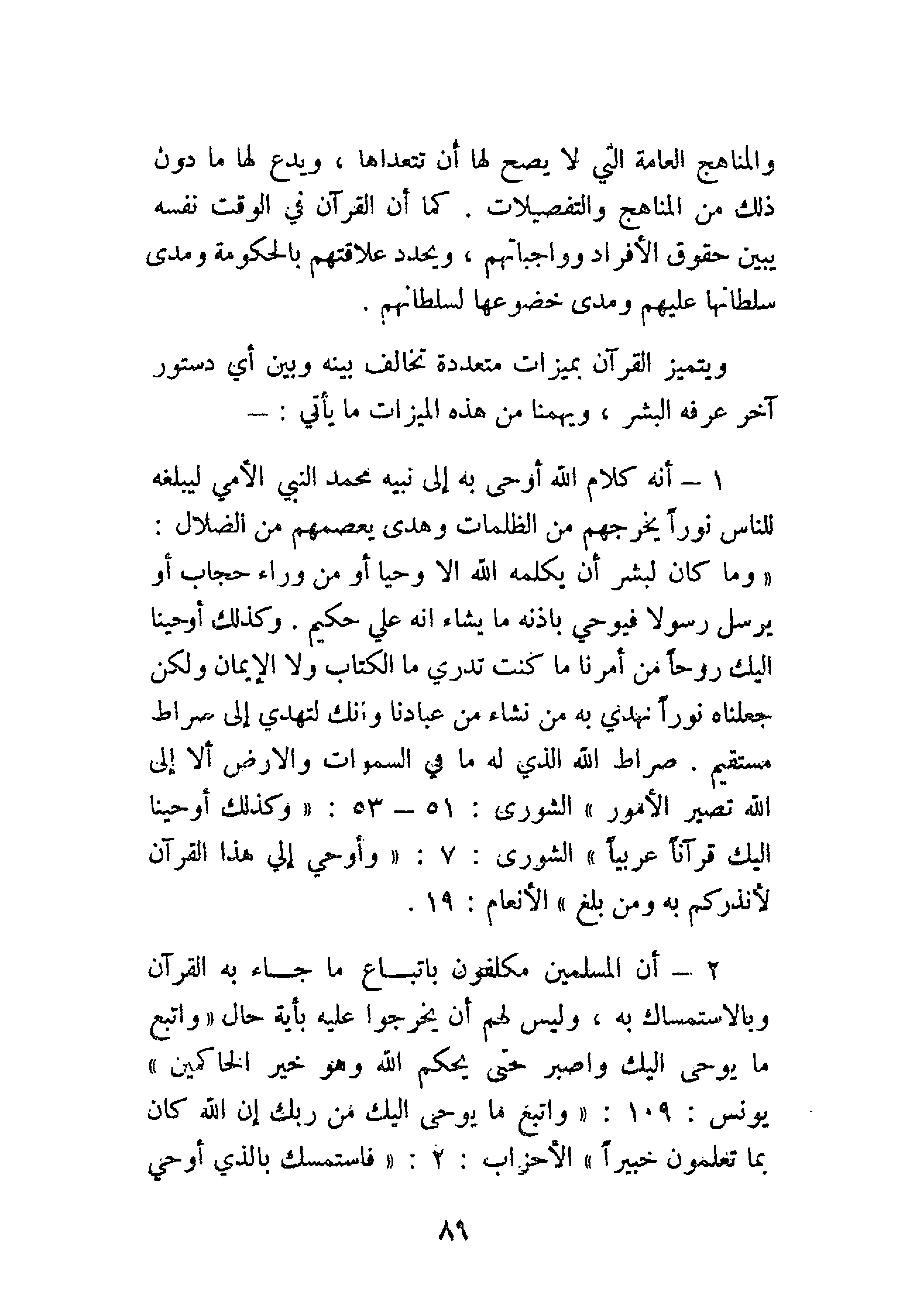 2 - أن المسلمين مكلفون باتباع ما جاء به القرآن وبالاستمساك به، وليس لهم أن يخرجوا عليه بأية حال {وَاتَّبِعْ مَا يُوحَى إِلَيْكَ وَاصْبِرْ حَتَّى يَحْكُمَ اللَّهُ وَهُوَ خَيْرُ الْحَاكِمِينَ} [يونس: 109]. {وَاتَّبِعْ مَا يُوحَى إِلَيْكَ مِنْ رَبِّكَ إِنَّ اللَّهَ كَانَ بِمَا تَعْمَلُونَ خَبِيرًا} [الأحزاب: 2]. {فَاسْتَمْسِكْ بِالَّذِي أُوحِيَ