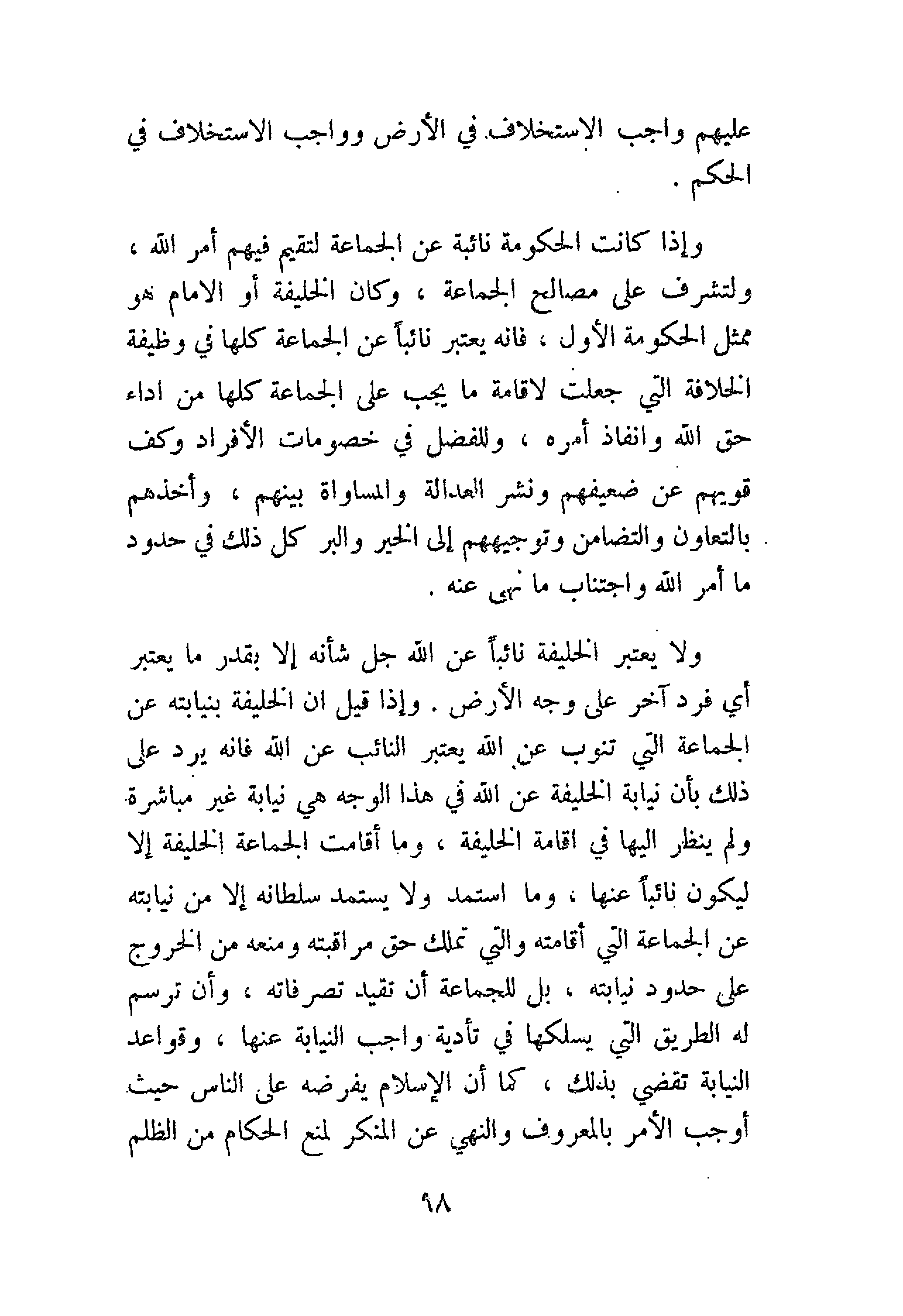 وإذا كانت الحكومة نائبة عن الجماعة لتقيم فيهم أمر الله، ولتشرف على مصالح الجماعة، وكان الخليفة أو الإمام هو ممثل الحكومة الأول، فإنه يعتبر نائبًا عن الجماعة كلها في وظيفة الخلافة التي جعلت لإقامة ما يجب على الجماعة كلها من أداء حق الله وإنفاذ أمره، وللفصل في خصومات الأفراد، وكف قويهم عن ضعيفهم ونشر العدالة والمساواة بينهم، وأخذهم بالتعاون والتضامن وتوجيههم إلى الخير والبر كل ذلك في حدود ما أمر الله واجتناب ما نهى عنه.