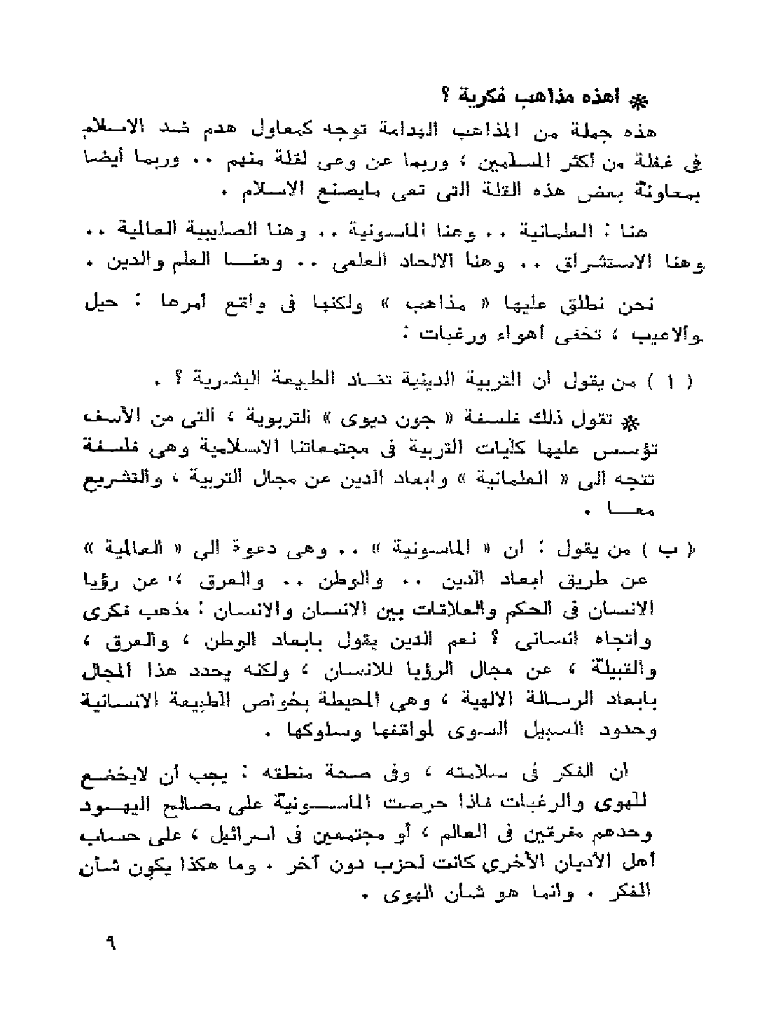 [ب] من يقول: إن «الماسونية» .. وهي دعوة إلى «العالمية» عن طريق إبعاد الدين .. والوطن .. والعرق، عن رؤيا الإنسان في الحكم والعلاقات بين الإنسان والإنسان: مذهب فكري واتجاه إنساني؟ نعم الدين يقول بأبعاد الوطن، والعرق، والقبيلة، عن مجال الرؤيا للإنسان، ولكنه يحدد هذا المجال بأبعاد الرسالة الإلهية، وهي المحيطة بخواص الطبيعة الإنسانية وحدود السبيل السوي لمواقفها وسلوكها.