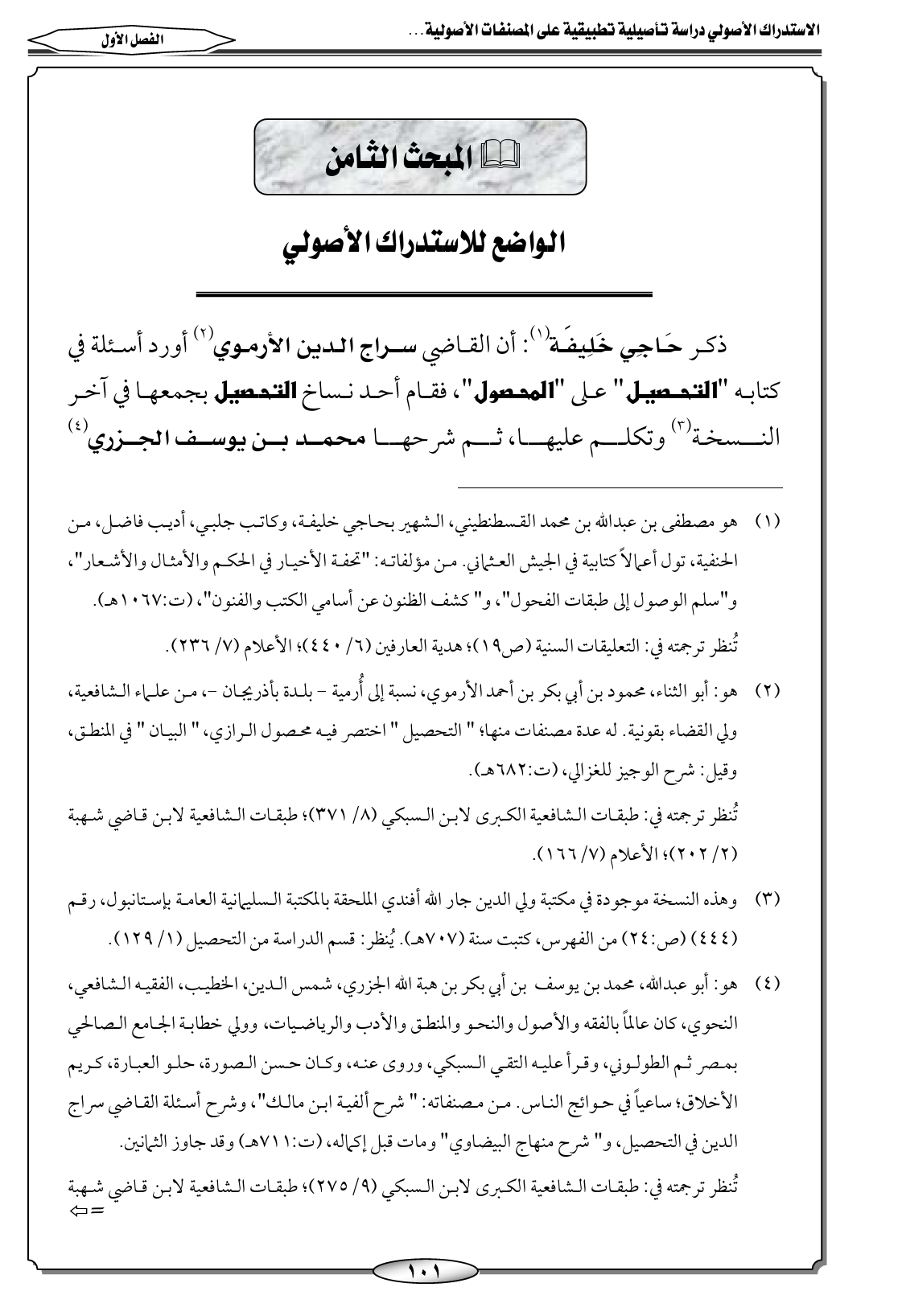 (٢) هو: أبو الثناء، محمود بن أبي بكر بن أحمد الأرموي، نسبة إلى أُرمية - بلدة بأذريجان -، من علماء الشافعية، ولي القضاء بقونية. له عدة مصنفات منها؛ " التحصيل " اختصر فيه محصول الرازي، " البيان " في المنطق، وقيل: شرح الوجيز للغزالي، (ت: ٦٨٢ هـ).