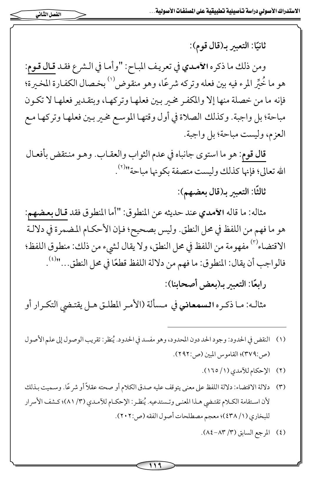 مثاله: ما قاله الآمدي عند حديثه عن المنطوق: "أما المنطوق فقد قال بعضهم: هو ما فهم من اللفظ في محل النطق. وليس بصحيح؛ فإن الأحكام المضمرة في دلالة الاقتضاء (٣) مفهومة من اللفظ في محل النطق، ولا يقال لشيء من ذلك: منطوق اللفظ؛ فالواجب أن يقال: المنطوق: ما فهم من دلالة اللفظ قطعًا في محل النطق ... " (٤).