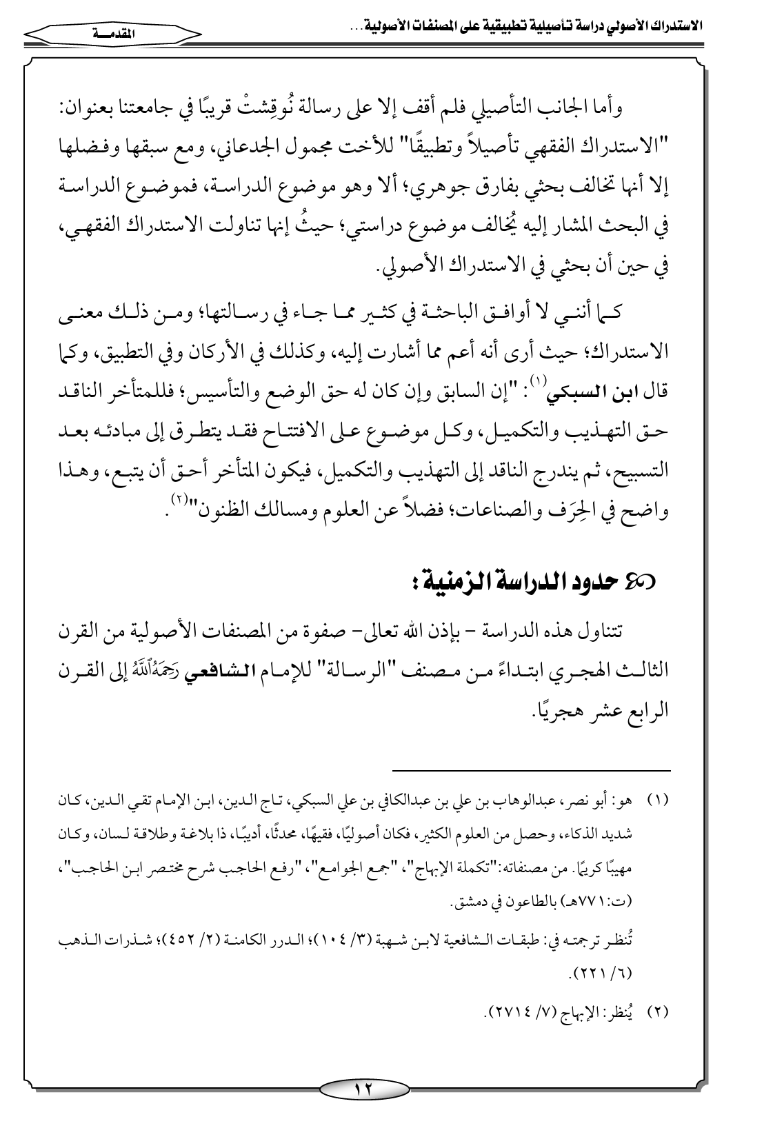 كما أنني لا أوافق الباحثة في كثير مما جاء في رسالتها؛ ومن ذلك معنى الاستدراك؛ حيث أرى أنه أعم مما أشارت إليه، وكذلك في الأركان وفي التطبيق، وكما قال ابن السبكي (١): "إن السابق وإن كان له حق الوضع والتأسيس؛ فللمتأخر الناقد حق التهذيب والتكميل، وكل موضوع على الافتتاح فقد يتطرق إلى مبادئه بعد التسبيح، ثم يندرج الناقد إلى التهذيب والتكميل، فيكون المتأخر أحق أن يتبع، وهذا واضح في الحِرَف والصناعات؛ فضلاً عن العلوم ومسالك الظنون" (٢).