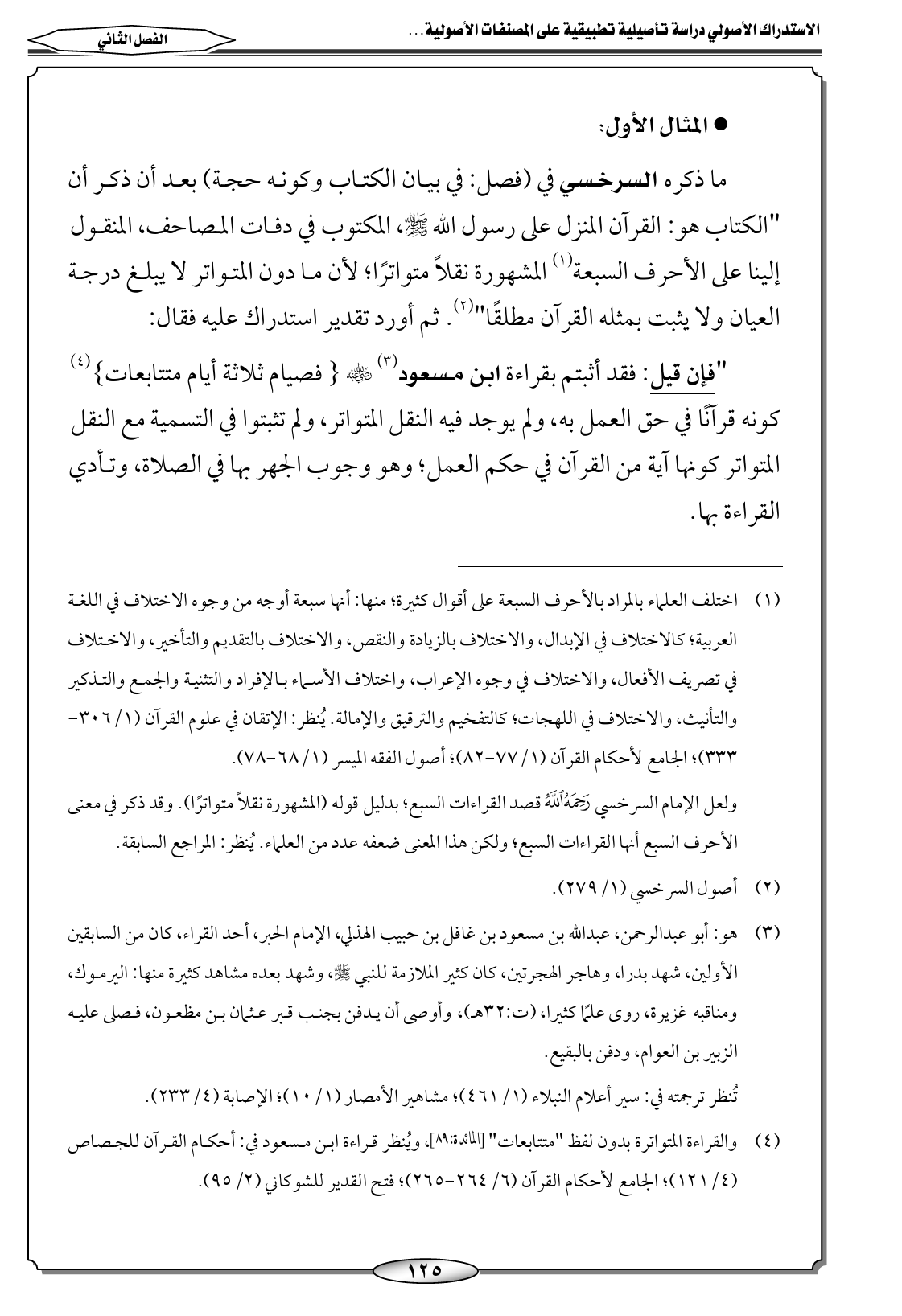 ما ذكره السرخسي في (فصل: في بيان الكتاب وكونه حجة) بعد أن ذكر أن "الكتاب هو: القرآن المنزل على رسول الله - صلى الله عليه وسلم -، المكتوب في دفات المصاحف، المنقول إلينا على الأحرف السبعة (١)