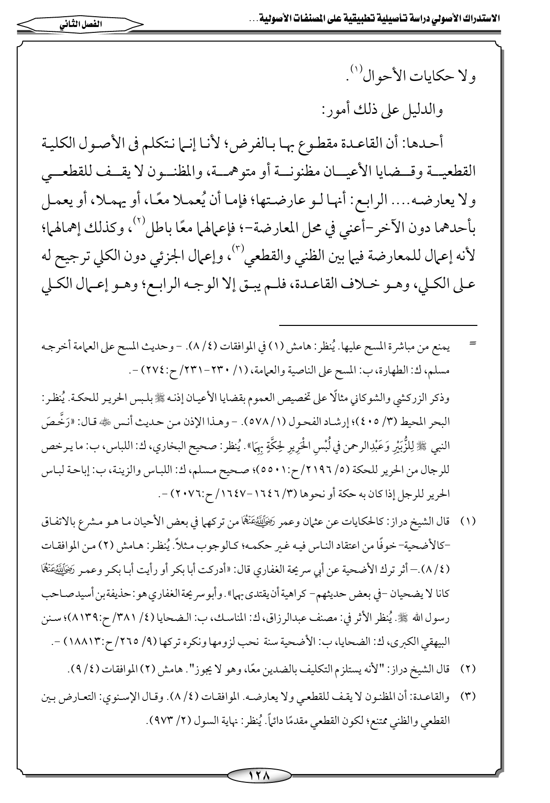 أحدها: أن القاعدة مقطوع بها بالفرض؛ لأنا إنما نتكلم فى الأصول الكلية القطعية وقضايا الأعيان مظنونة أو متوهمة، والمظنون لا يقف للقطعي ولا يعارضه .... الرابع: أنها لو عارضتها؛ فإما أن يُعملا معًا، أو يهملا، أو يعمل بأحدهما دون الآخر-أعني في محل المعارضة-؛ فإعمالهما معًا باطل (٢)، وكذلك إهمالهما؛ لأنه إعمال للمعارضة فيما بين الظني والقطعي (٣)، وإعمال الجزئي دون الكلي ترجيح له على الكلي، وهو خلاف القاعدة، فلم يبق إلا الوجه الرابع؛ وهو إعمال الكلي