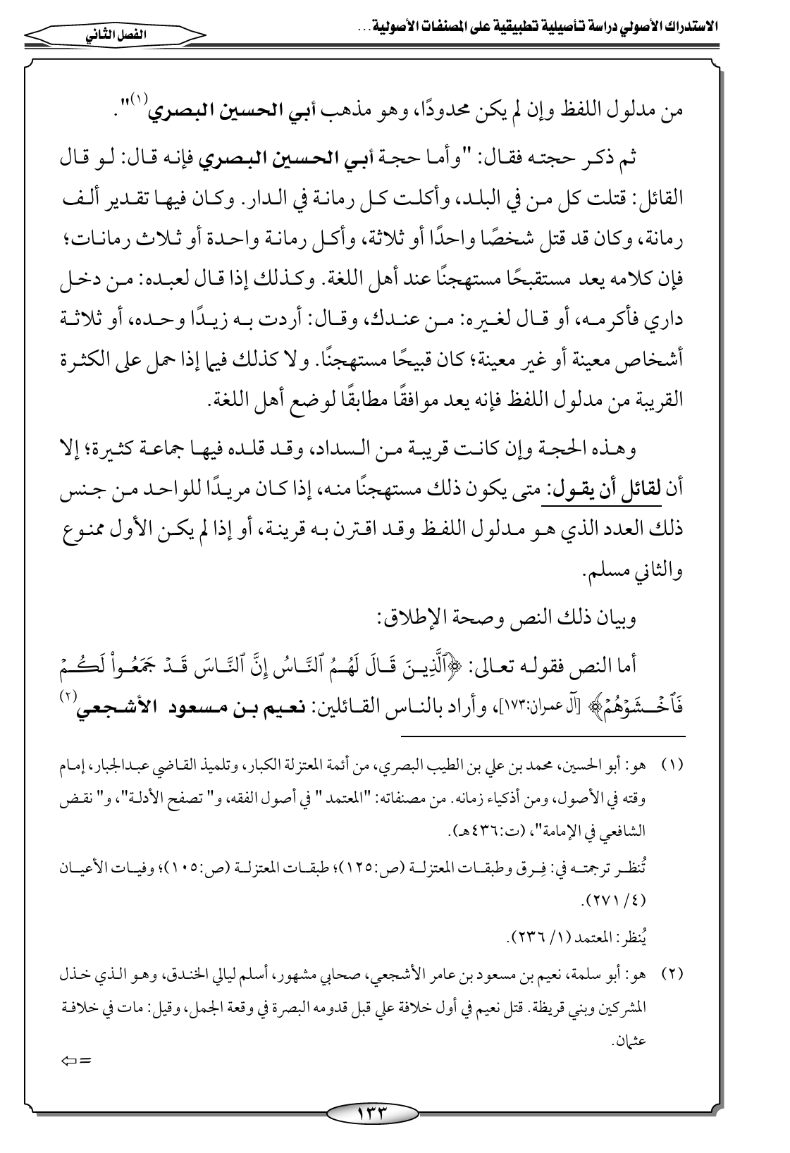 (١) هو: أبو الحسين، محمد بن علي بن الطيب البصري، من أئمة المعتزلة الكبار، وتلميذ القاضي عبدالجبار، إمام وقته في الأصول، ومن أذكياء زمانه. من مصنفاته: "المعتمد " في أصول الفقه، و" تصفح الأدلة"، و" نقض الشافعي في الإمامة"، (ت: ٤٣٦ هـ).