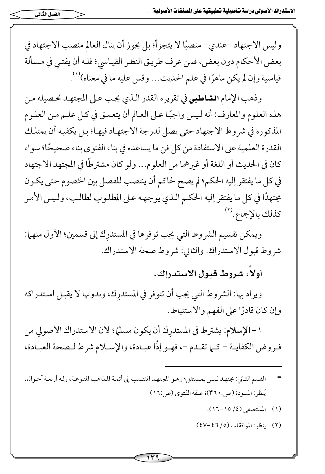 وذهب الإمام الشاطبي في تقريره القدر الذي يجب على المجتهد تحصيله من هذه العلوم والمعارف: أنه ليس واجبًا على العالم أن يتعمق في كل علم من العلوم المذكورة في شروط الاجتهاد حتى يصل لدرجة الاجتهاد فيها؛ بل يكفيه أن يمتلك القدرة العلمية على الاستفادة من كل فن ما يساعده في بناء الفتوى بناء صحيحًا؛ سواء كان في الحديث أو اللغة أو غيرهما من العلوم ... ولو كان مشترطًا في المجتهد الاجتهاد في كل ما يفتقر إليه الحكم؛ لم يصح لحاكم أن ينتصب للفصل بين الخصوم حتى يكون مجتهدًا في كل ما يفتقر إليه الحكم الذي يوجهه على المطلوب لطالب، وليس الأمر كذلك بالإجماع. (٢)
