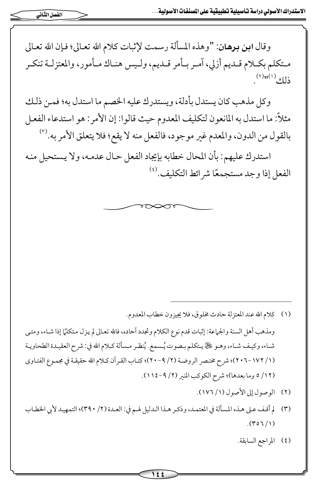 وقال ابن برهان: "وهذه المسألة رسمت لإثبات كلام الله تعالى؛ فإن الله تعالى متكلم بكلام قديم أزلي، آمر بأمر قديم، وليس هناك مأمور، والمعتزلة تنكر ذلك (١) " (٢).