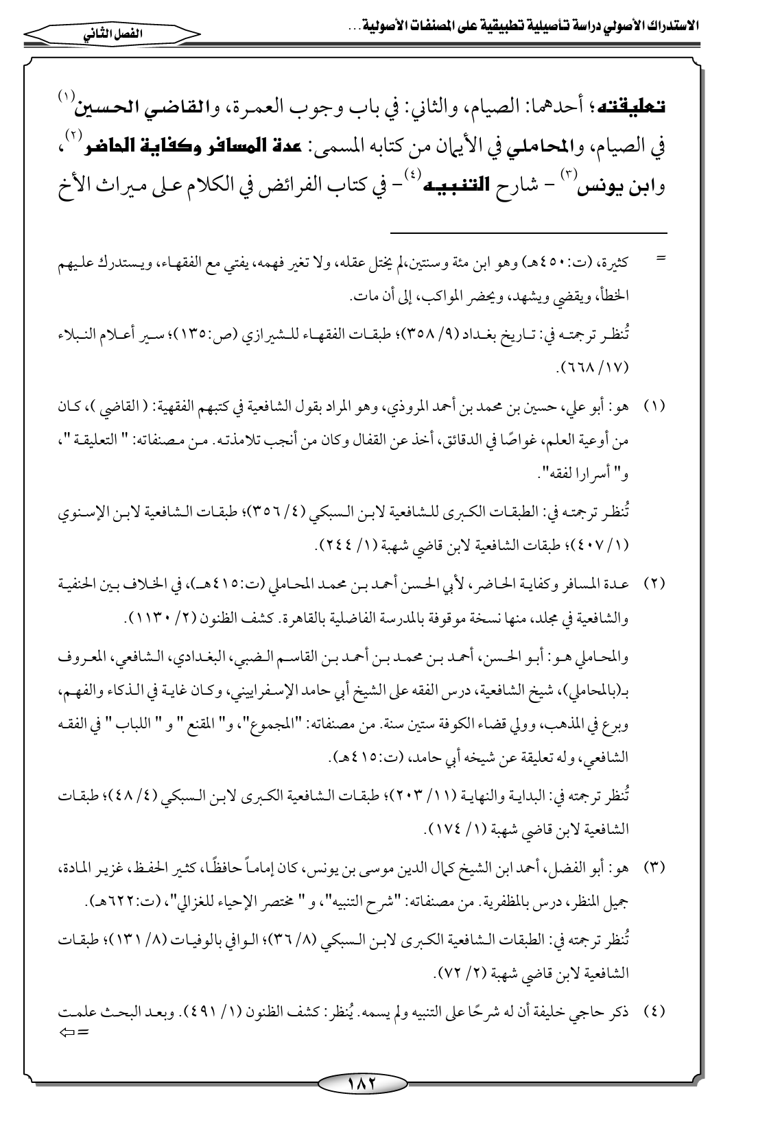 تعليقته؛ أحدهما: الصيام، والثاني: في باب وجوب العمرة، والقاضي الحسين (١) في الصيام، والمحاملي في الأيمان من كتابه المسمى: عدة المسافر وكفاية الحاضر (٢)، وابن يونس (٣) - شارح التنبيه (٤) - في كتاب الفرائض في الكلام على ميراث الأخ