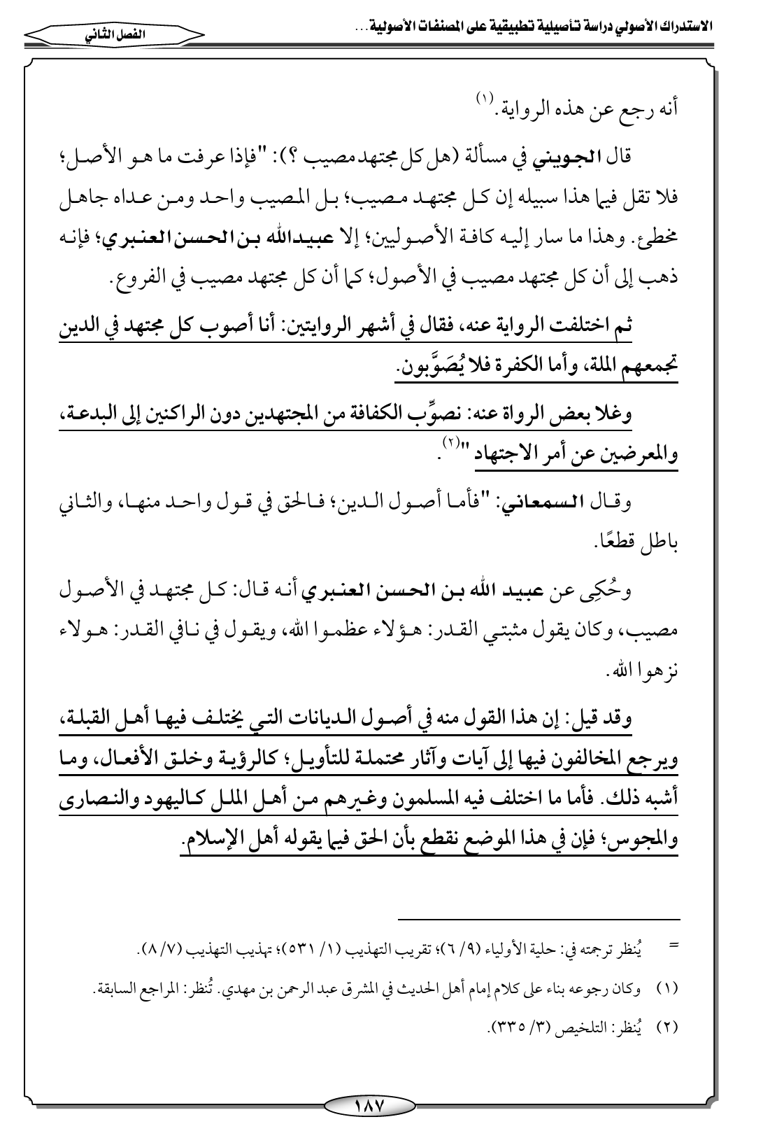 قال الجويني في مسألة (هل كل مجتهد مصيب؟ ): "فإذا عرفت ما هو الأصل؛ فلا تقل فيما هذا سبيله إن كل مجتهد مصيب؛ بل المصيب واحد ومن عداه جاهل مخطئ. وهذا ما سار إليه كافة الأصوليين؛ إلا عبيدالله بن الحسن العنبري؛ فإنه ذهب إلى أن كل مجتهد مصيب في الأصول؛ كما أن كل مجتهد مصيب في الفروع.
