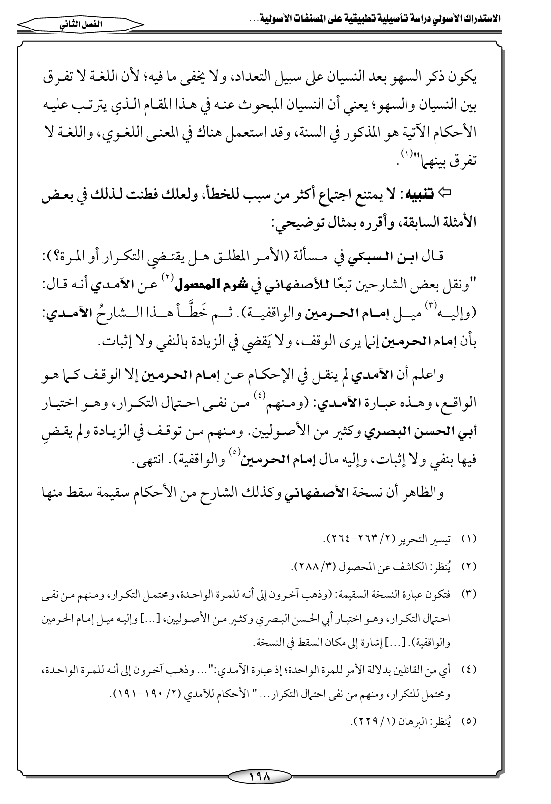 واعلم أن الآمدي لم ينقل في الإحكام عن إمام الحرمين إلا الوقف كما هو الواقع، وهذه عبارة الآمدي: (ومنهم (٤) من نفى احتمال التكرار، وهو اختيار أبي الحسن البصري وكثير من الأصوليين. ومنهم من توقف في الزيادة ولم يقضِ فيها بنفي ولا إثبات، وإليه مال إمام الحرمين (٥) والواقفية). انتهى.