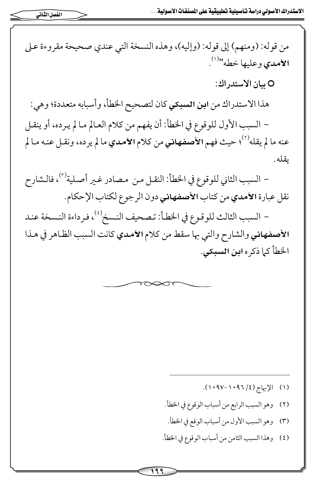 - السبب الثالث للوقوع في الخطأ: تصحيف النسخ (٤)، فرداءة النسخة عند الأصفهاني والشارح والتي بها سقط من كلام الآمدي كانت السبب الظاهر في هذا الخطأ كما ذكره ابن السبكي.
