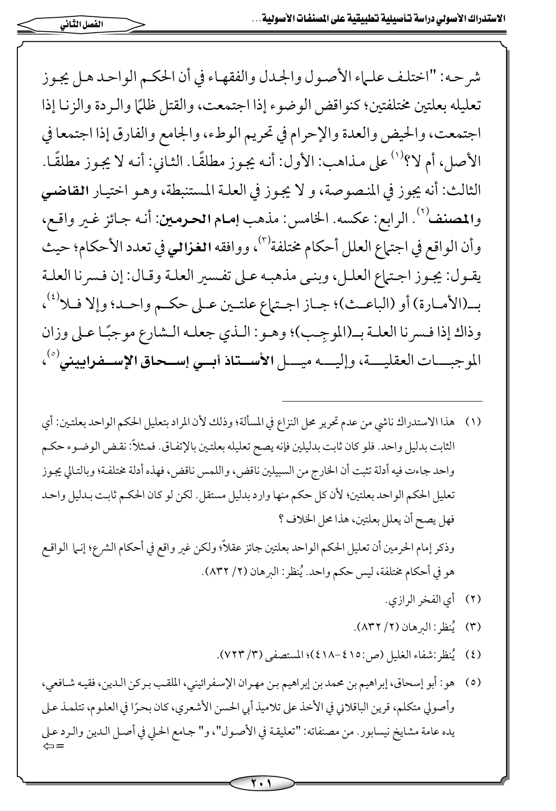 وذكر إمام الحرمين أن تعليل الحكم الواحد بعلتين جائز عقلاً؛ ولكن غير واقع في أحكام الشرع؛ إنما الواقع هو في أحكام مختلفة، ليس حكم واحد. يُنظر: البرهان (٢/ ٨٣٢).